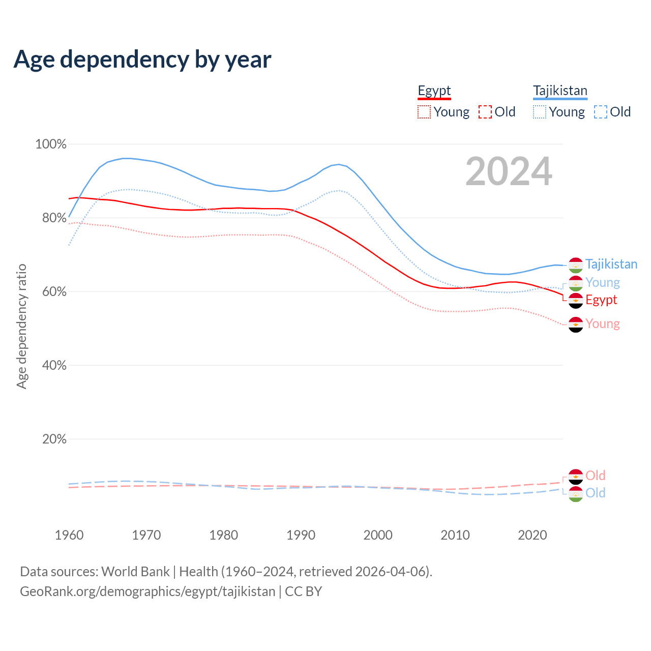 - Egypt is ranked 133/196 by median age (oldest to youngest) vs 142/196 for Tajikistan.