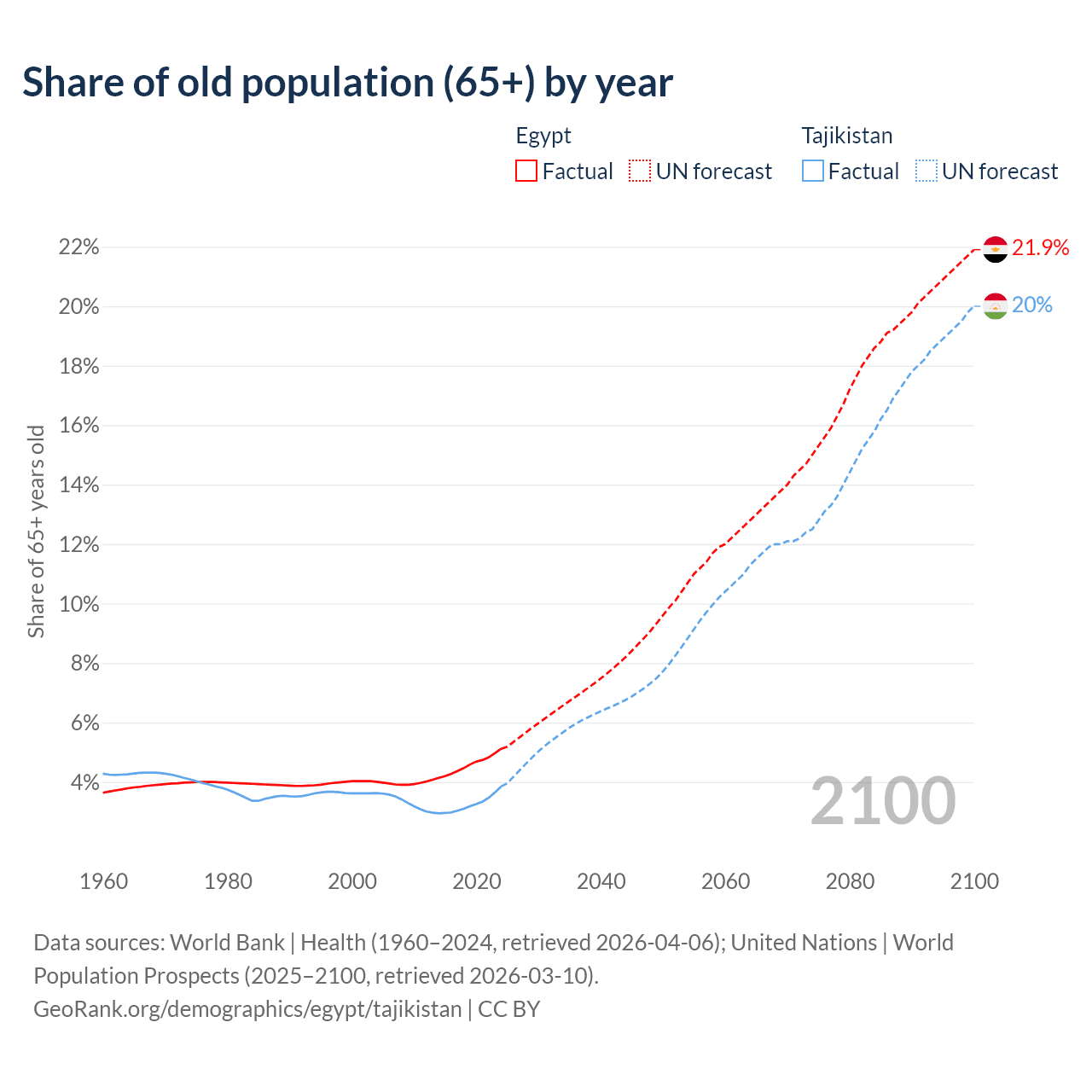 - The share of old-age demographic (65+) in Egypt is 5.12% vs 3.85% in Tajikistan.