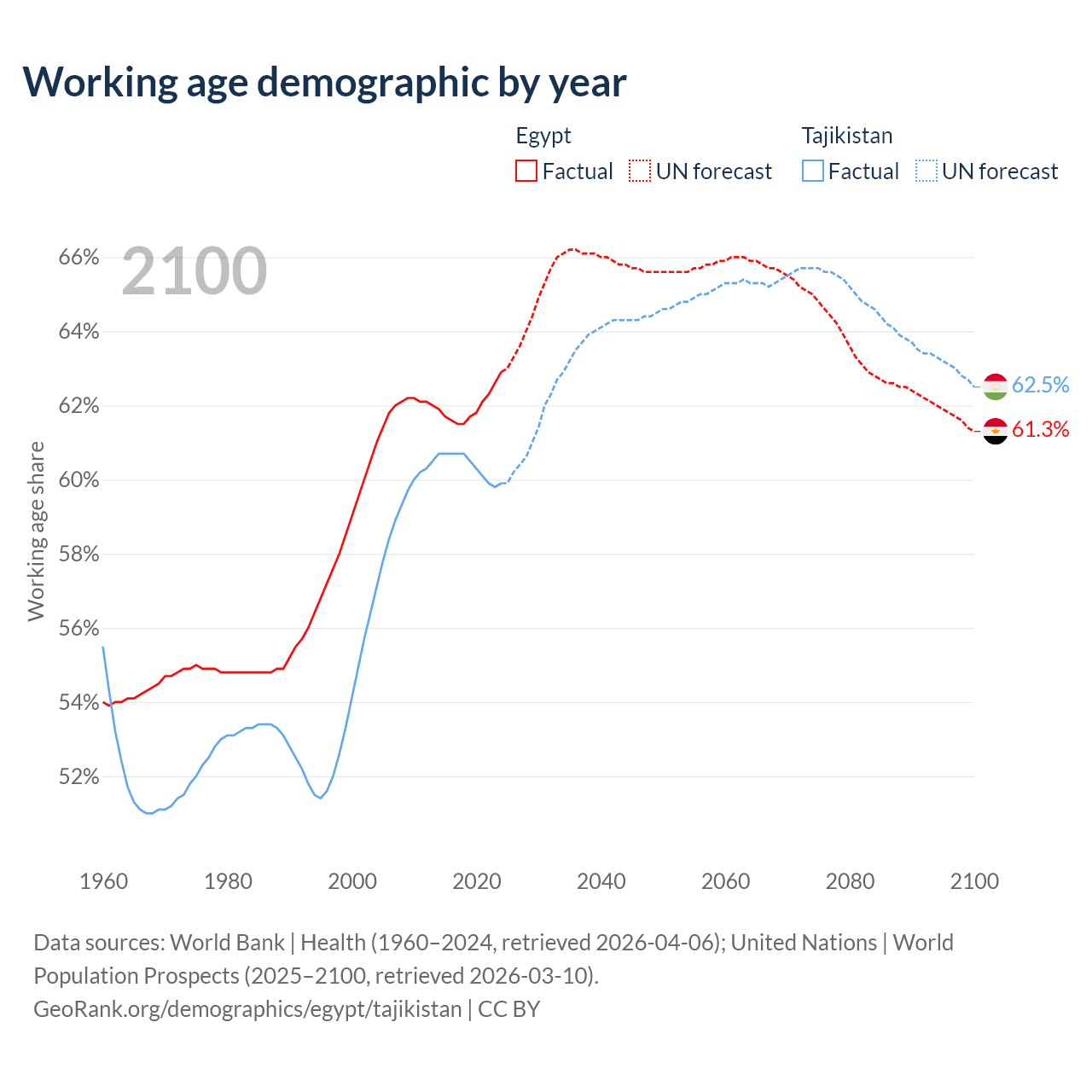 - Egypt has 75.9M working age adults (aged 15-64) vs 6.61M in Tajikistan.