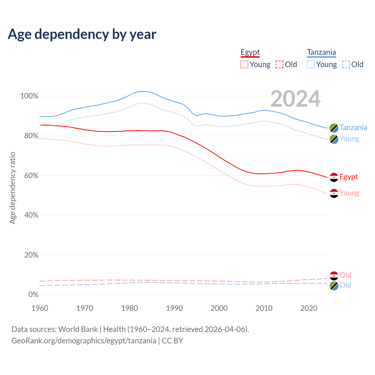 Data sources: World Bank | Health (1960–2024, retrieved 2026-04-06); U.S. Census Bureau (1960–2024, retrieved 2026-02-08).