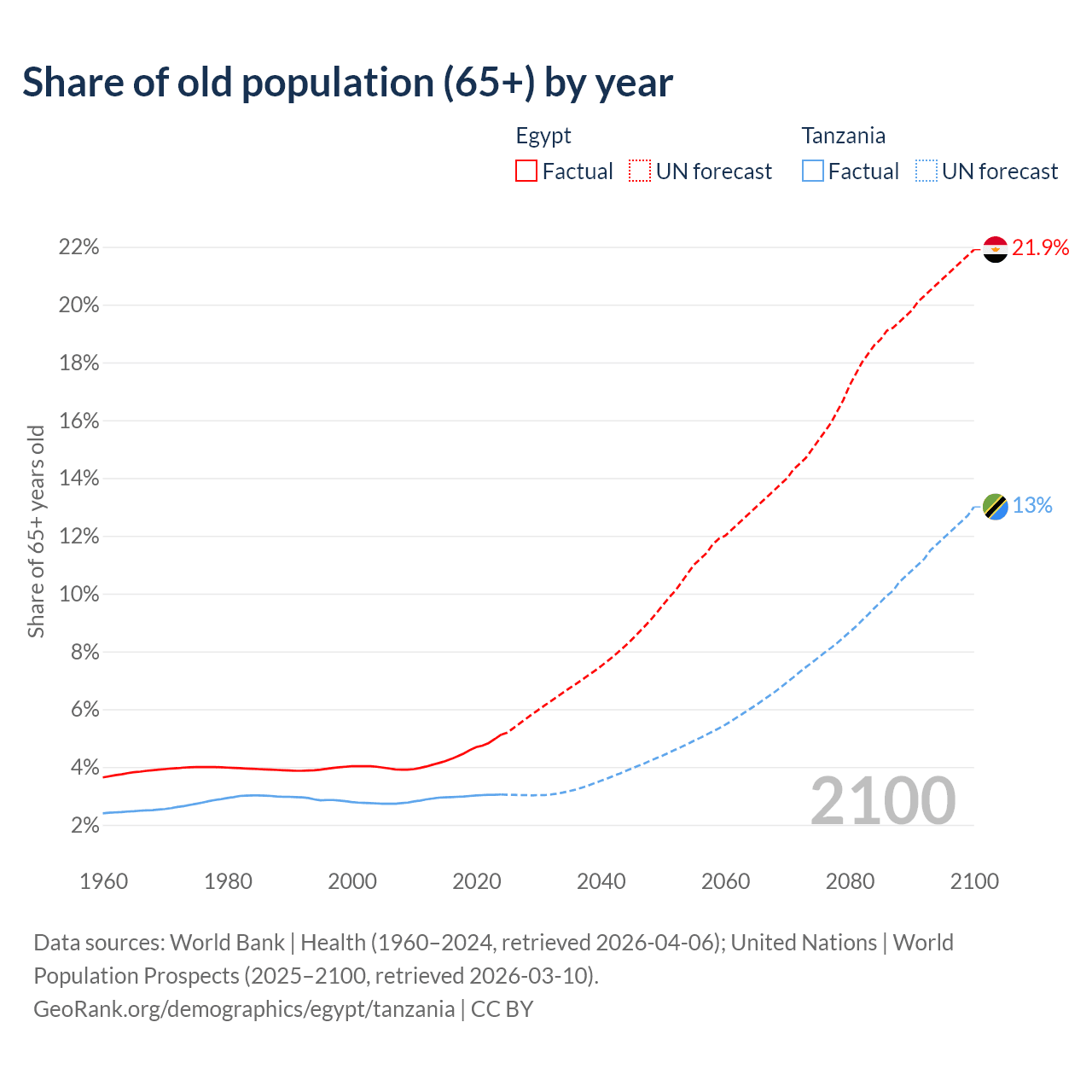 The share of older people aged 65 and over is 5.12% in Egypt and 3.05% in Tanzania. Life expectancy in Egypt compared to Tanzania .