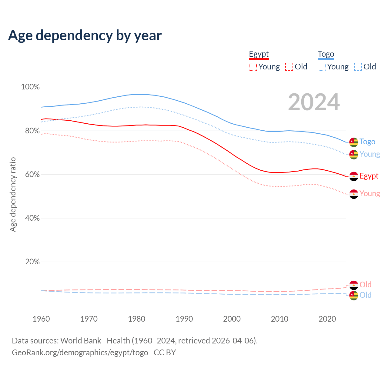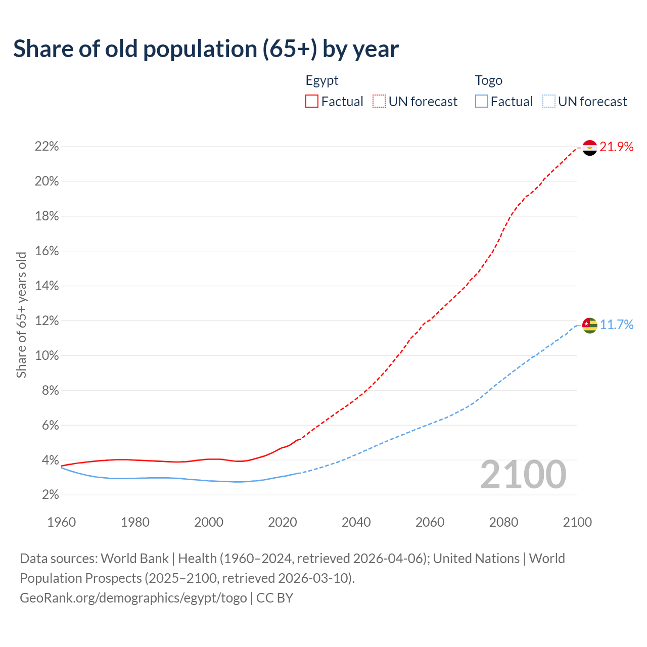 The share of older people aged 65 and over is 5.12% in Egypt and 3.21% in Togo. Life expectancy in Egypt compared to Togo .