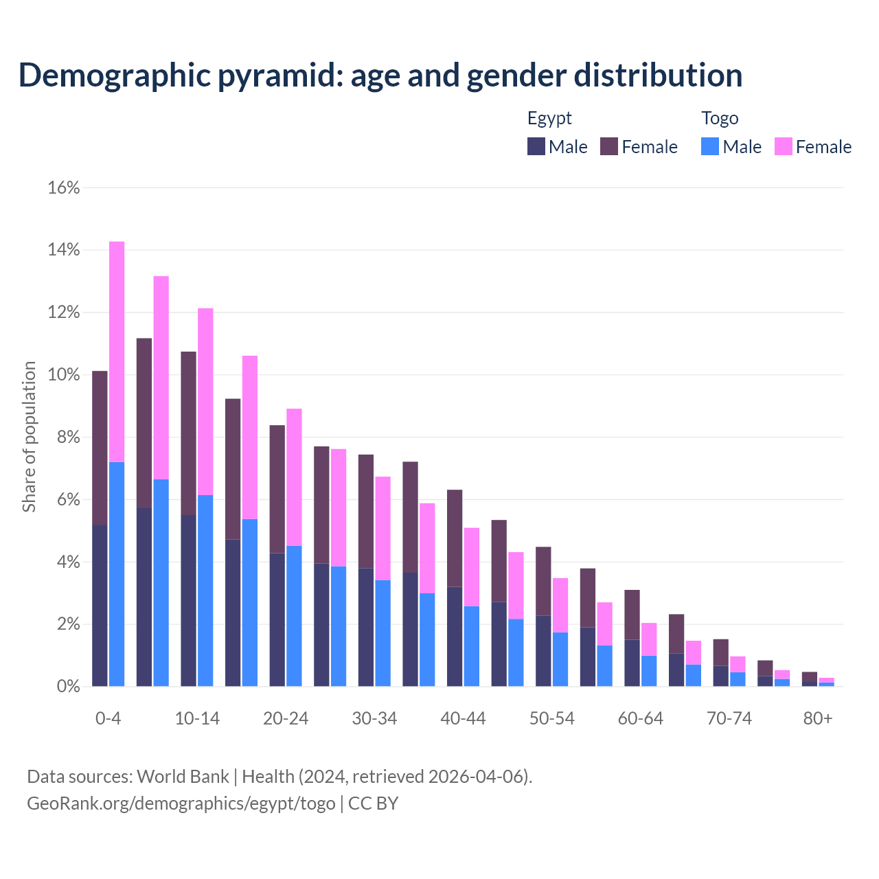 - Egypt is ranked 133/196 by median age (oldest to youngest) vs 166/196 for Togo.
