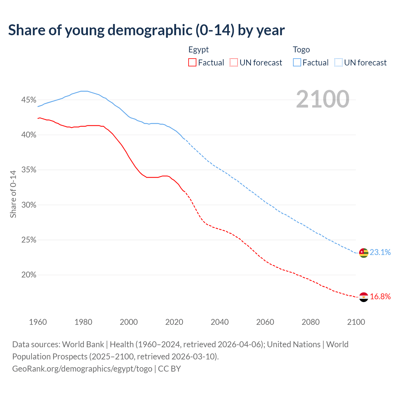 - The share of young demographic (0-15 years old) in Egypt is 32% vs 39.5% in Togo.