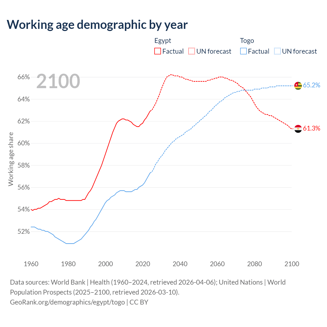 - Egypt has 75.9M working age adults (aged 15-64) vs 5.72M in Togo.