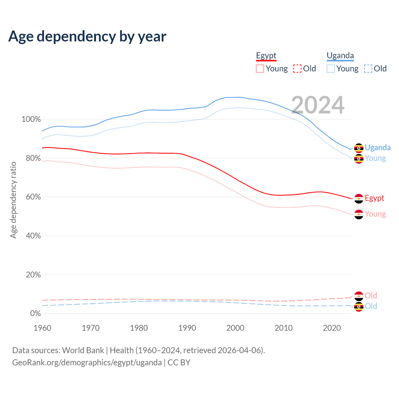 - Egypt is ranked 133/196 by median age (oldest to youngest) vs 187/196 for Uganda.