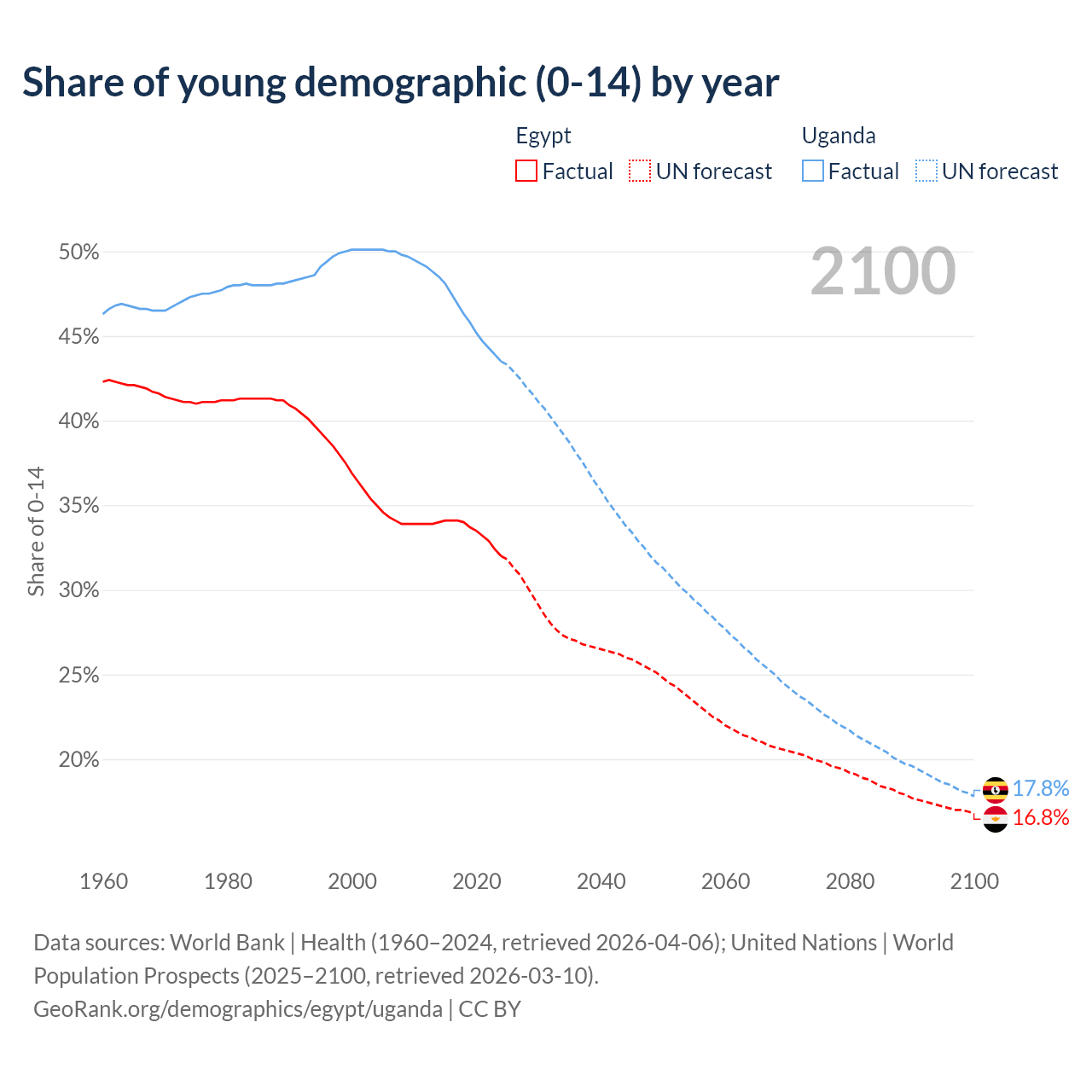- The share of young demographic (0-15 years old) in Egypt is 32% vs 43.5% in Uganda.