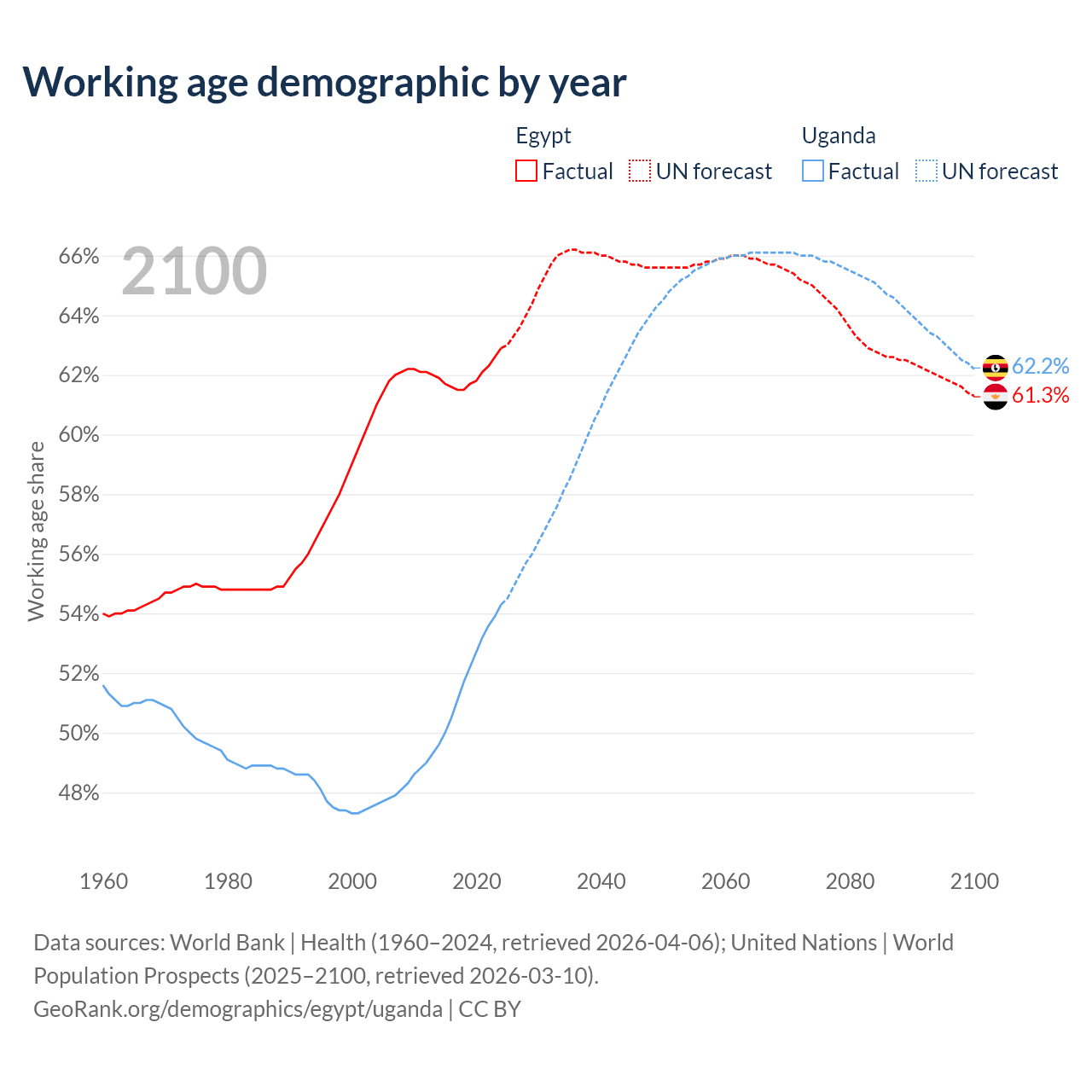 - Egypt has 75.9M working age adults (aged 15-64) vs 28.9M in Uganda.