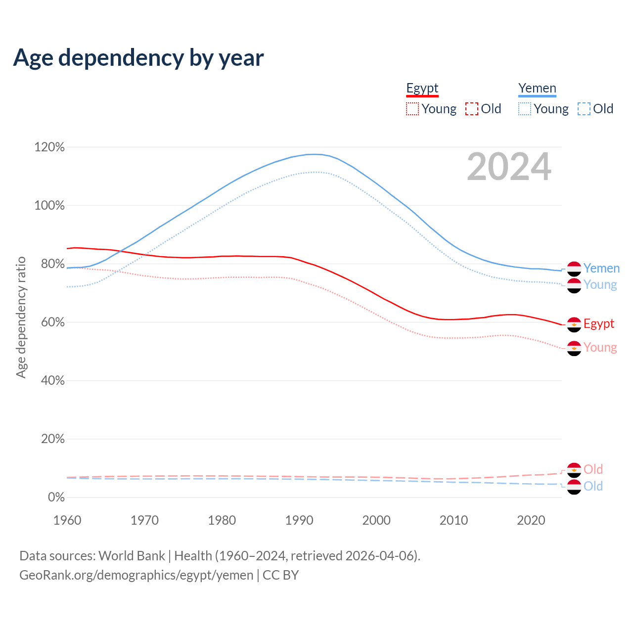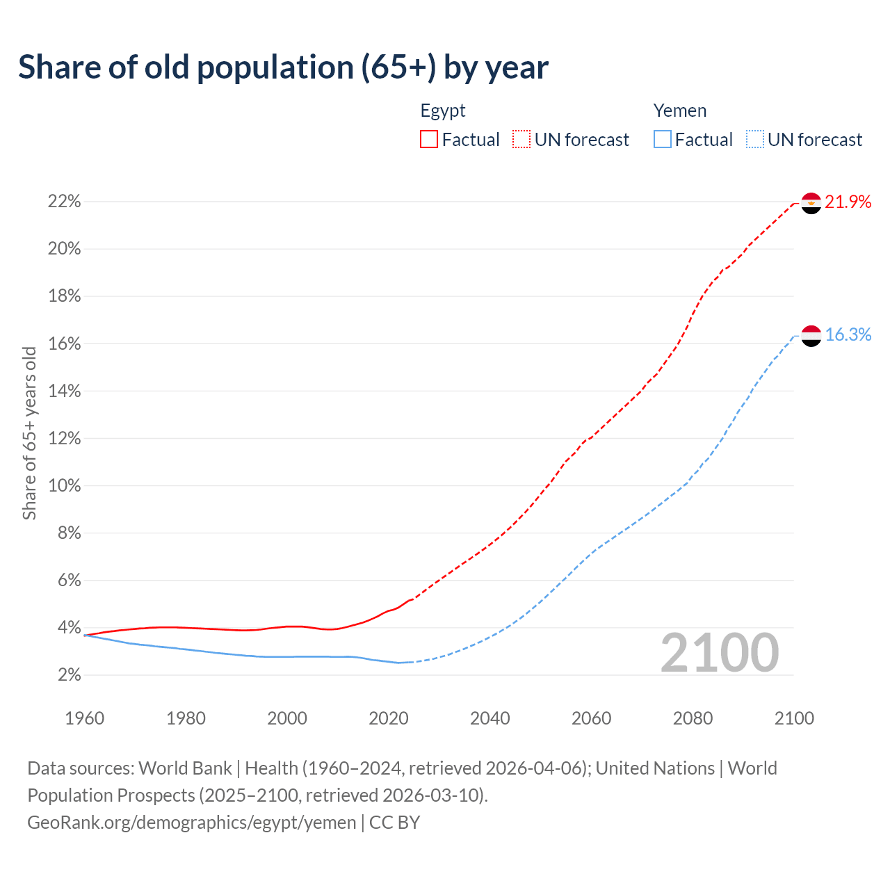 The share of older people aged 65 and over is 5.12% in Egypt and 2.52% in Yemen. Life expectancy in Egypt compared to Yemen .
