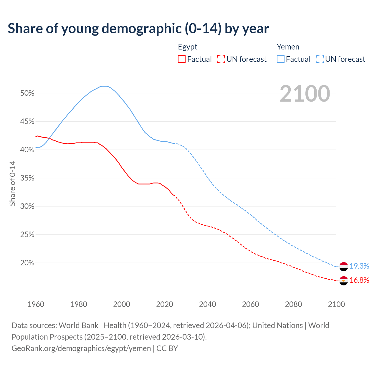 - The share of young demographic (0-15 years old) in Egypt is 32% vs 41.1% in Yemen.