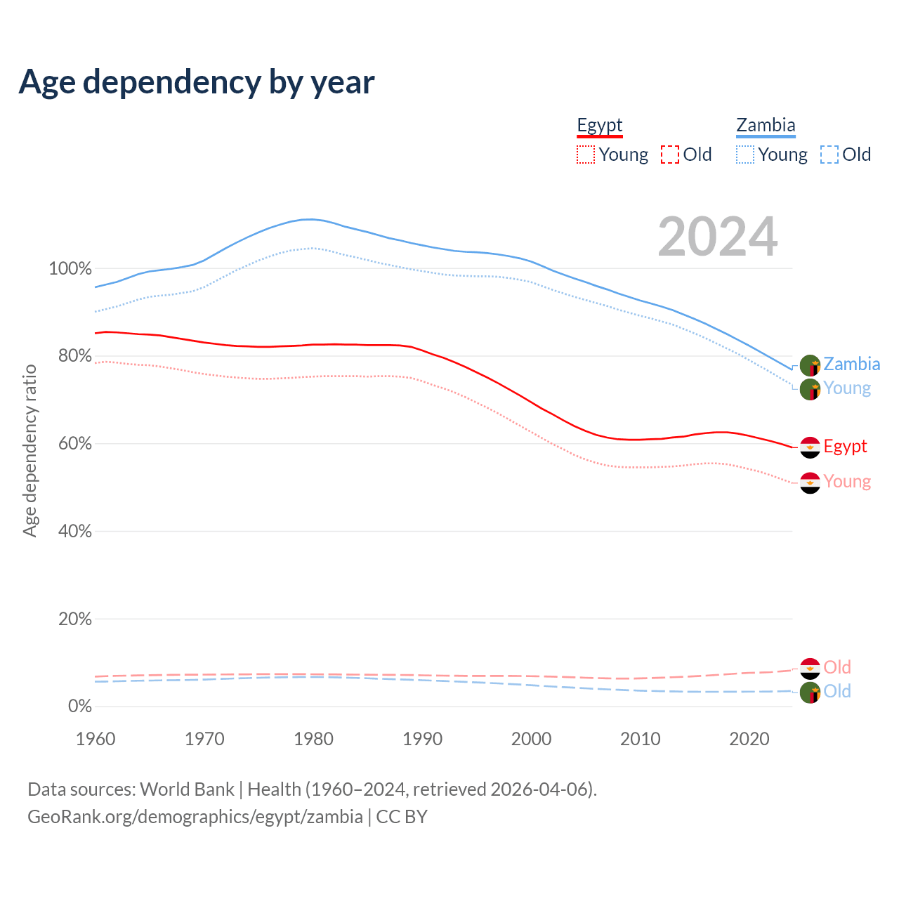 - Egypt is ranked 133/196 by median age (oldest to youngest) vs 182/196 for Zambia.
