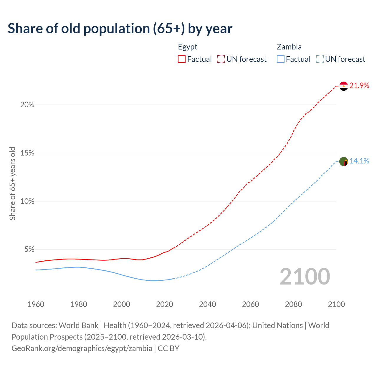 The share of older people aged 65 and over is 5.12% in Egypt and 1.95% in Zambia. Life expectancy in Egypt compared to Zambia .