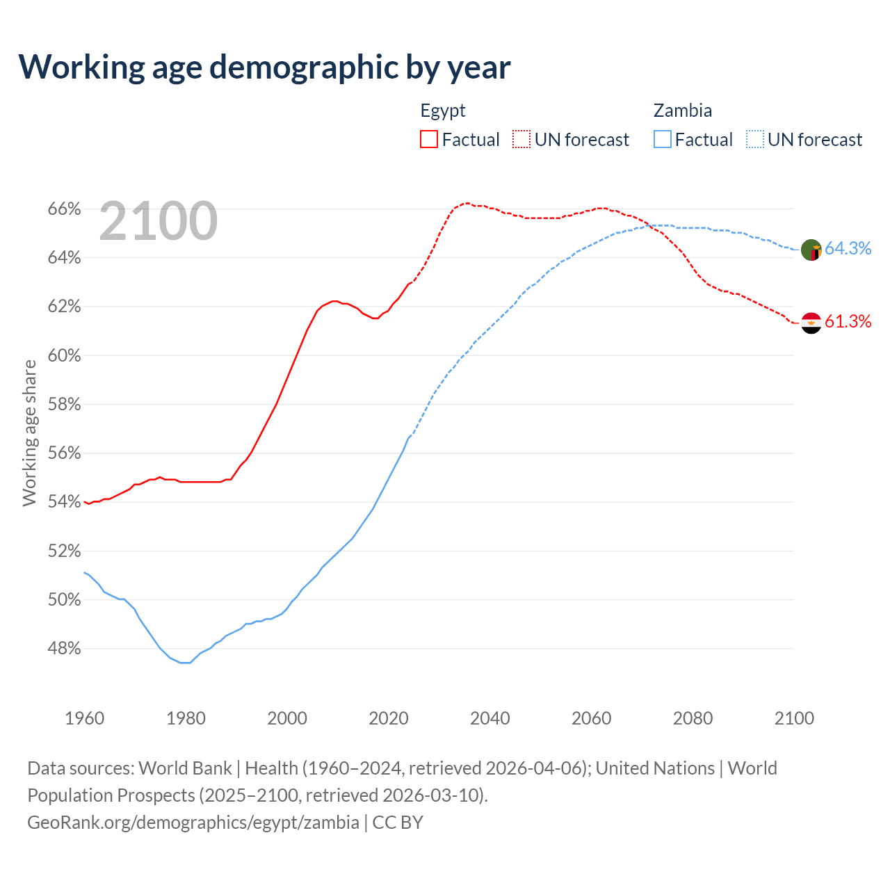 - Egypt has 75.9M working age adults (aged 15-64) vs 12.8M in Zambia.