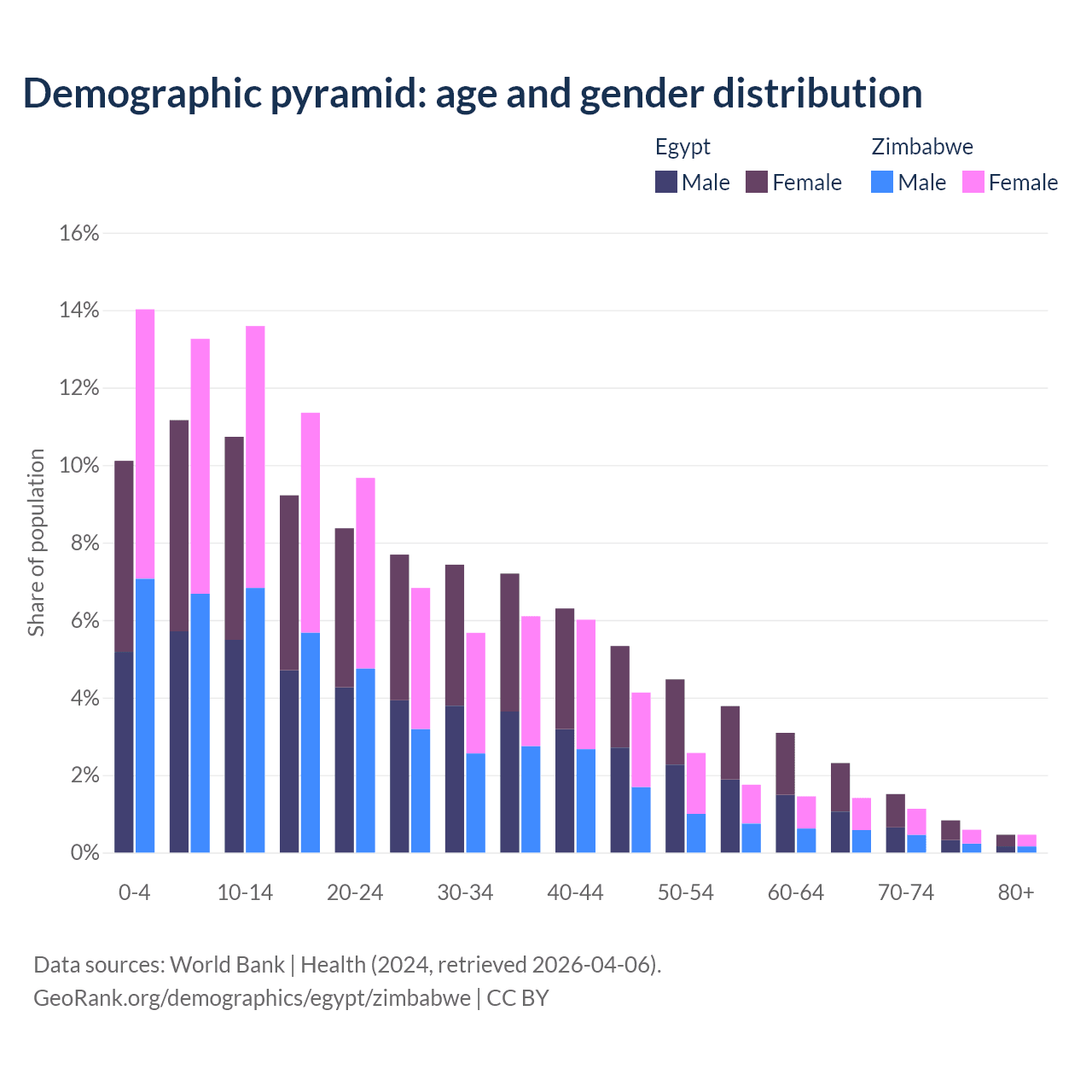- Egypt is ranked 133/196 by median age (oldest to youngest) vs 177/196 for Zimbabwe.