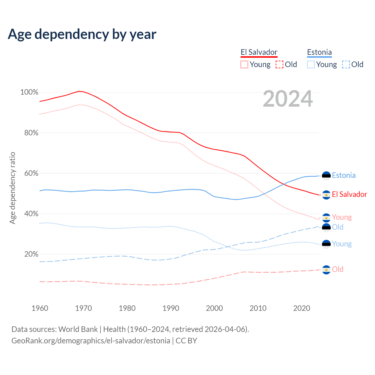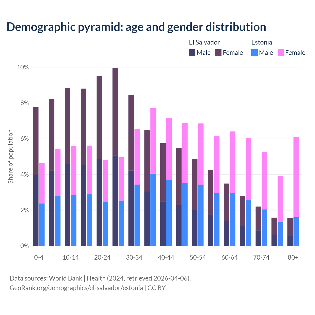 - The share of young demographic (0-15 years old) in El Salvador is 24.8% vs 15.6% in Estonia.