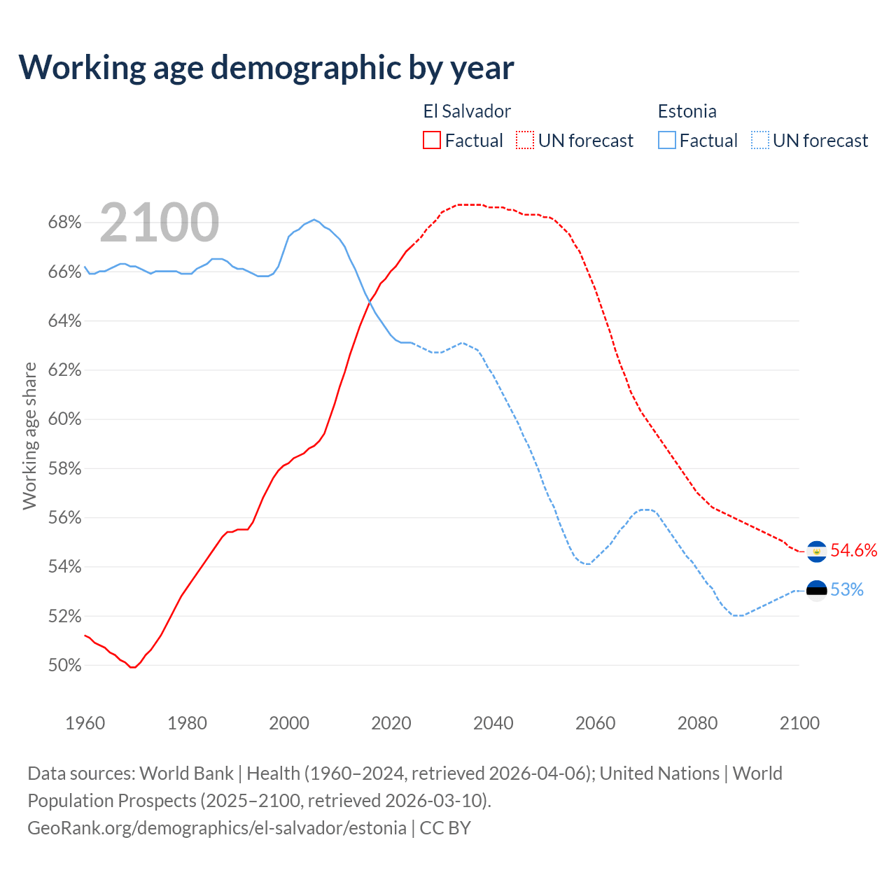 Median age El Salvador vs Estonia, 1960-2100