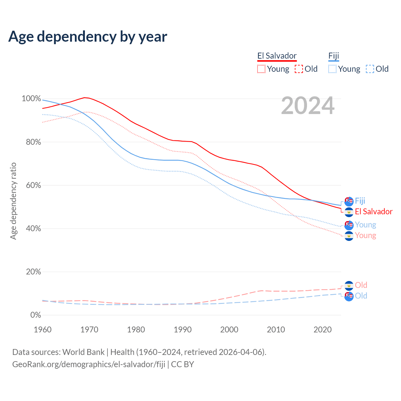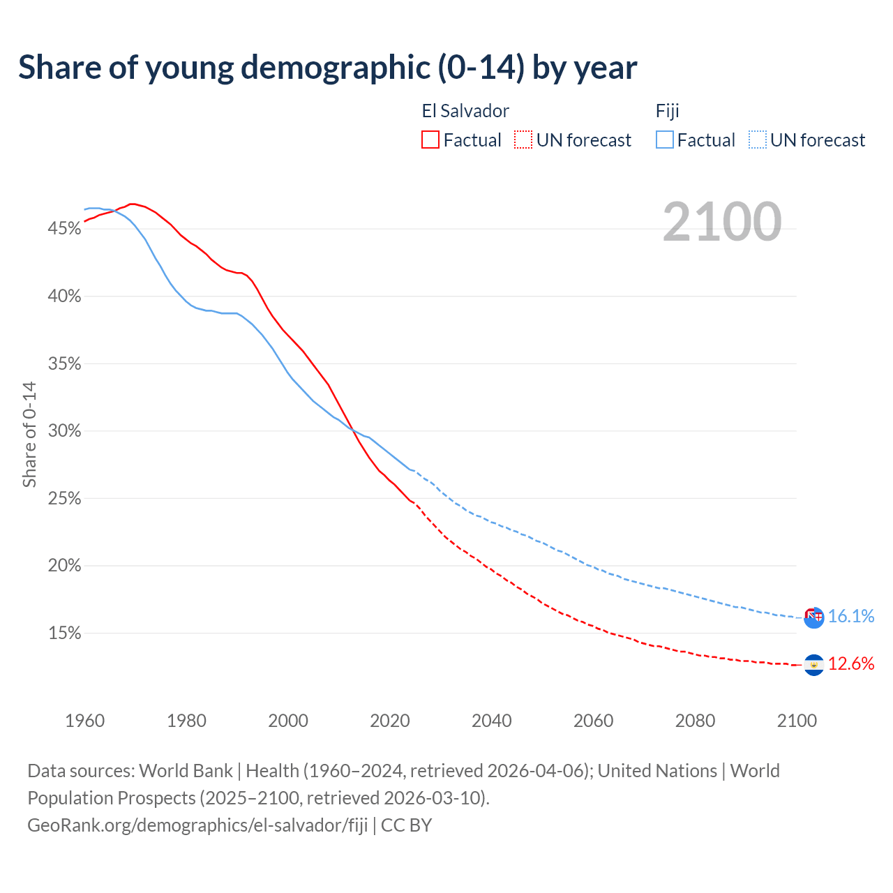 - The share of young demographic (0-15 years old) in El Salvador is 24.8% vs 27.1% in Fiji.