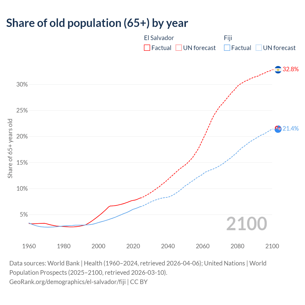 - The share of old-age demographic (65+) in El Salvador is 8.15% vs 6.49% in Fiji.