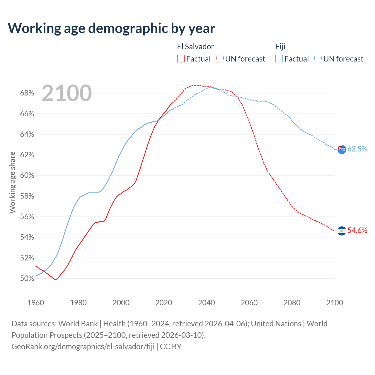 Median age El Salvador vs Fiji, 1960-2100
