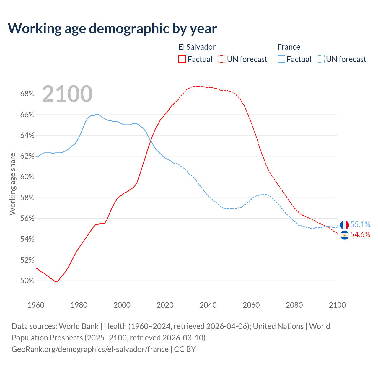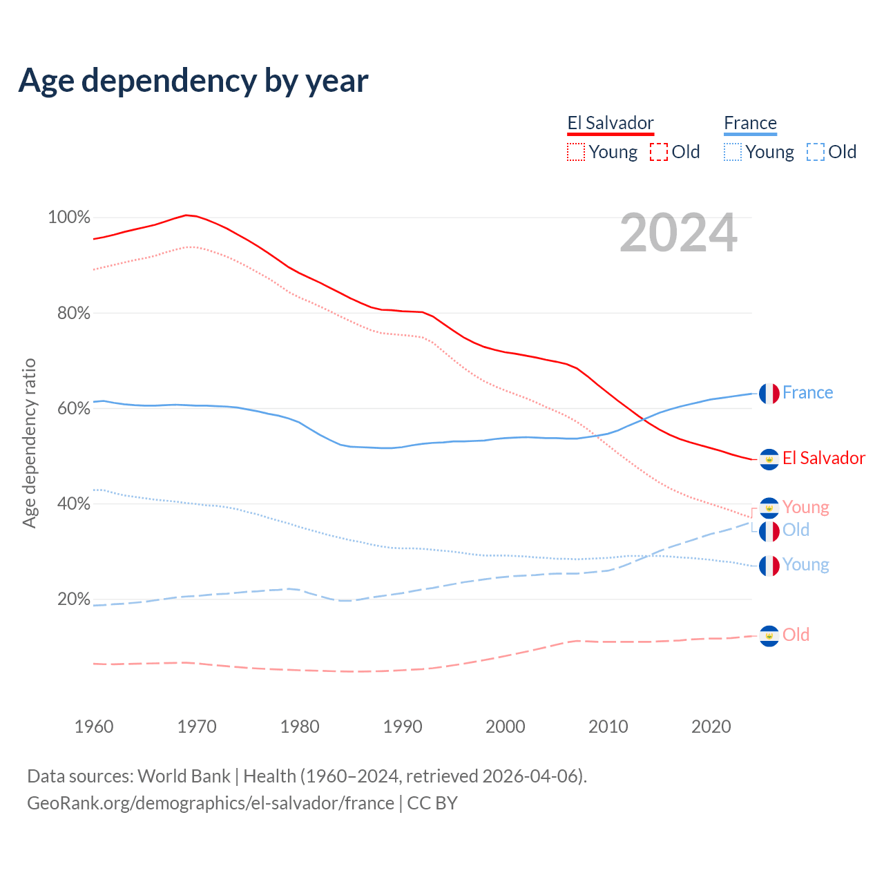- The share of old-age demographic (65+) in El Salvador is 8.15% vs 22.1% in France.