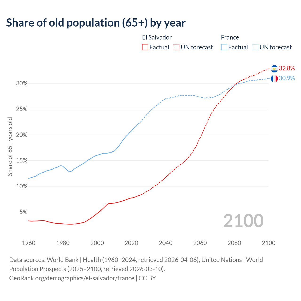 The share of older people aged 65 and over is 8.15% in El Salvador and 22.1% in France. Life expectancy in El Salvador compared to France .