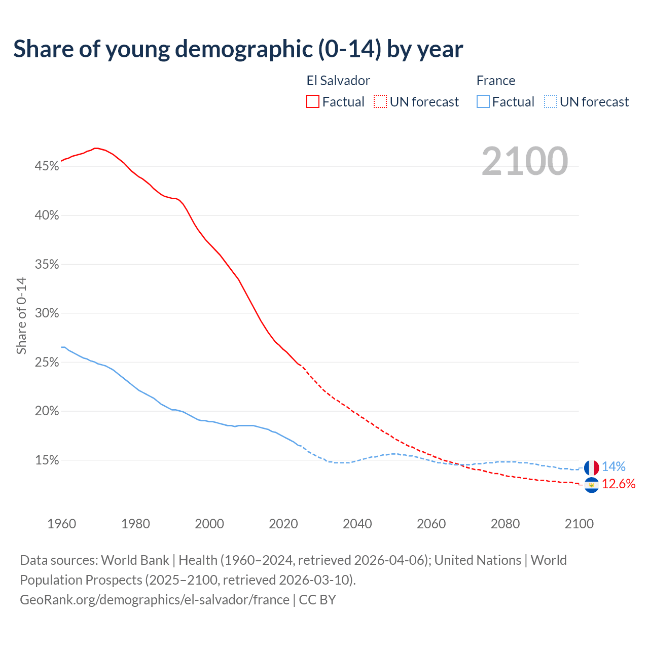 - The share of young demographic (0-15 years old) in El Salvador is 24.8% vs 16.5% in France.
