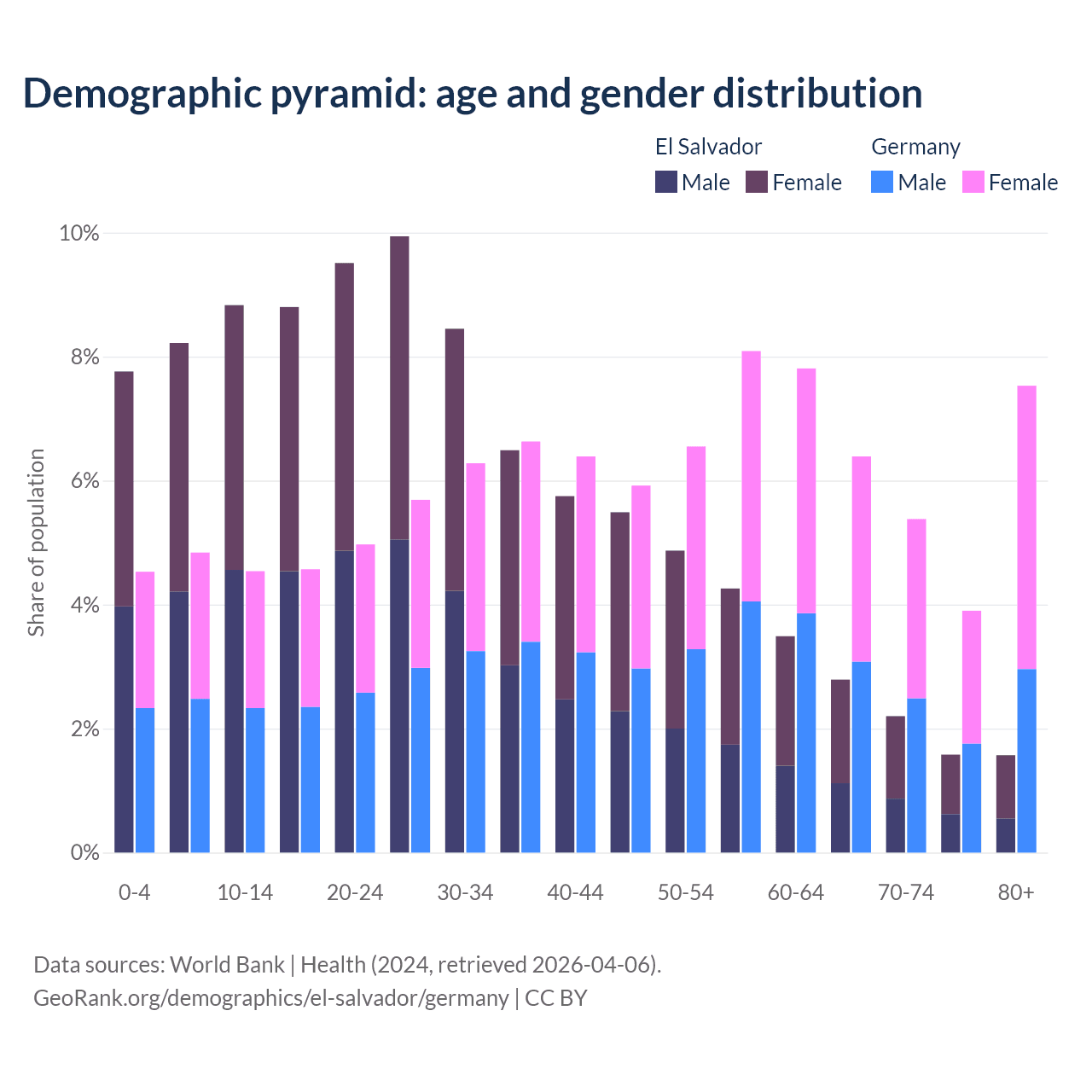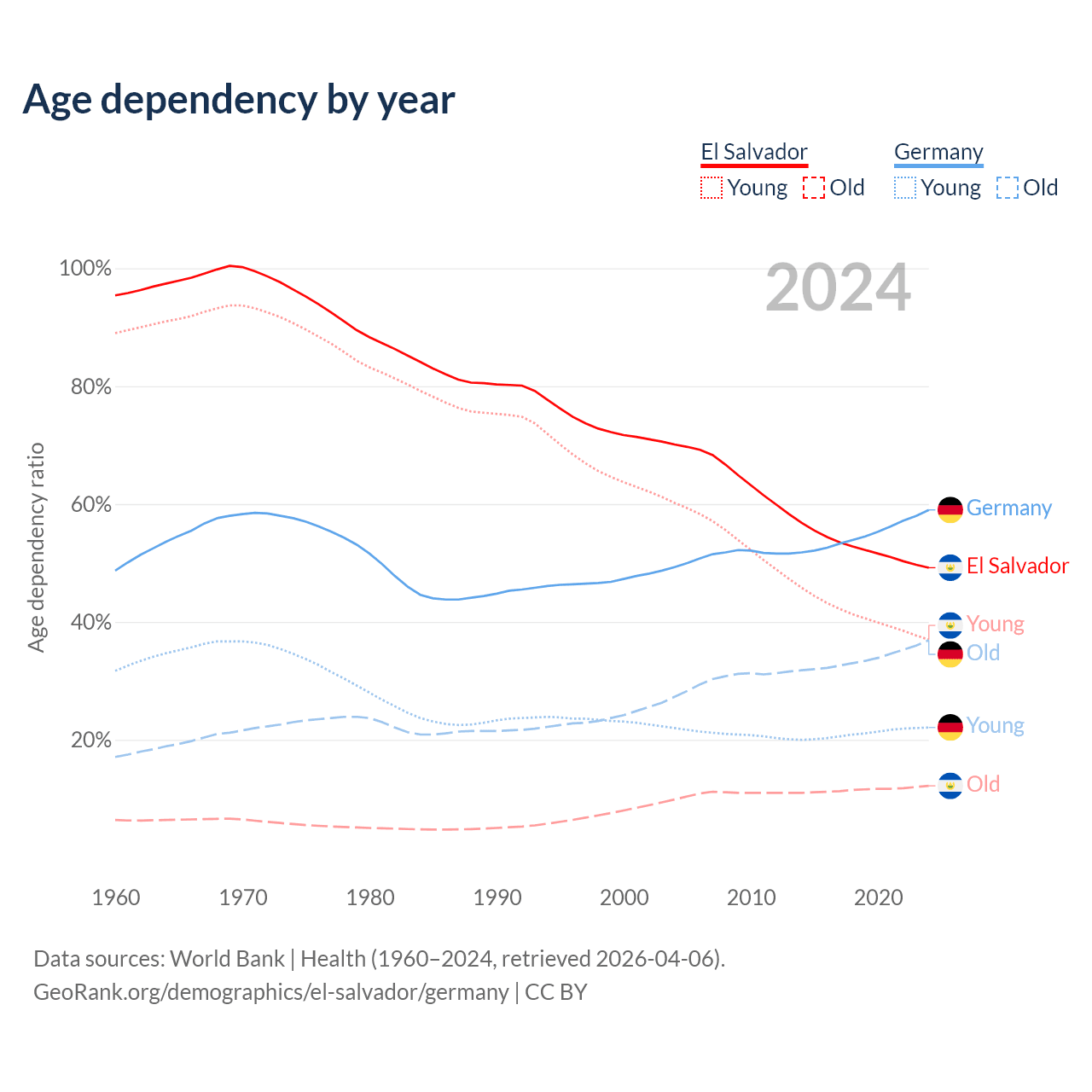- El Salvador is ranked 115/196 by median age (oldest to youngest) vs 9/196 for Germany.