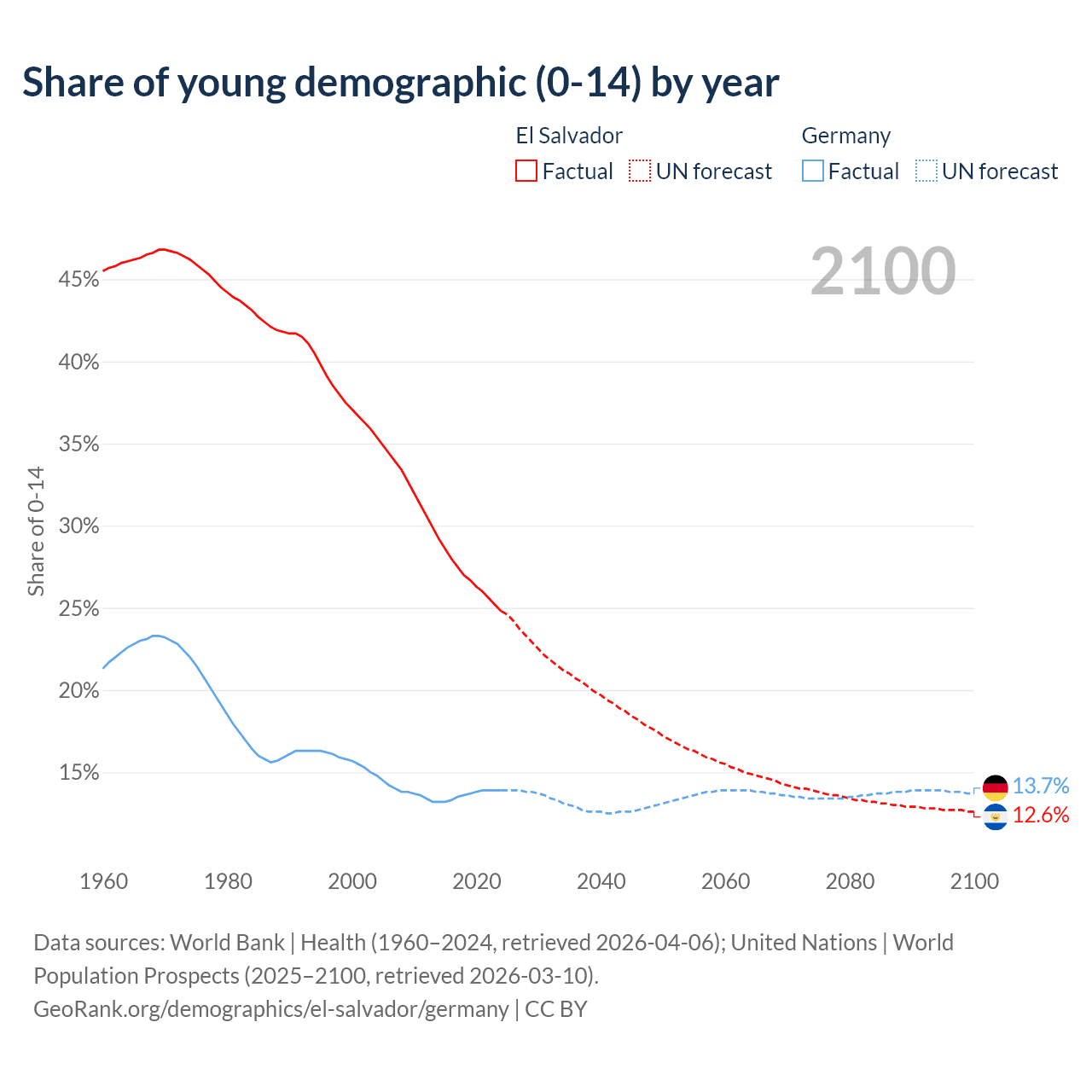 - The share of young demographic (0-15 years old) in El Salvador is 24.8% vs 13.9% in Germany.