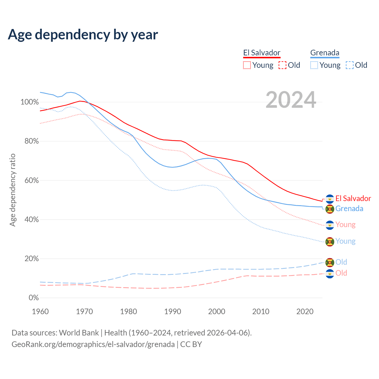 Data sources: World Bank | Health (1960–2024, retrieved 2026-04-06); U.S. Census Bureau (1960–2024, retrieved 2026-02-08).