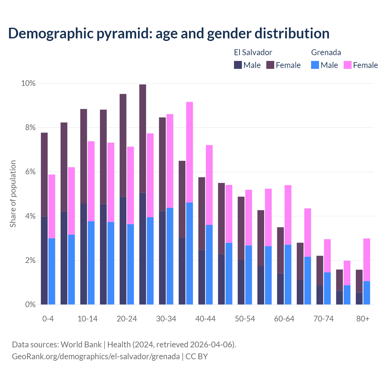 - The share of young demographic (0-15 years old) in El Salvador is 24.8% vs 19.4% in Grenada.
