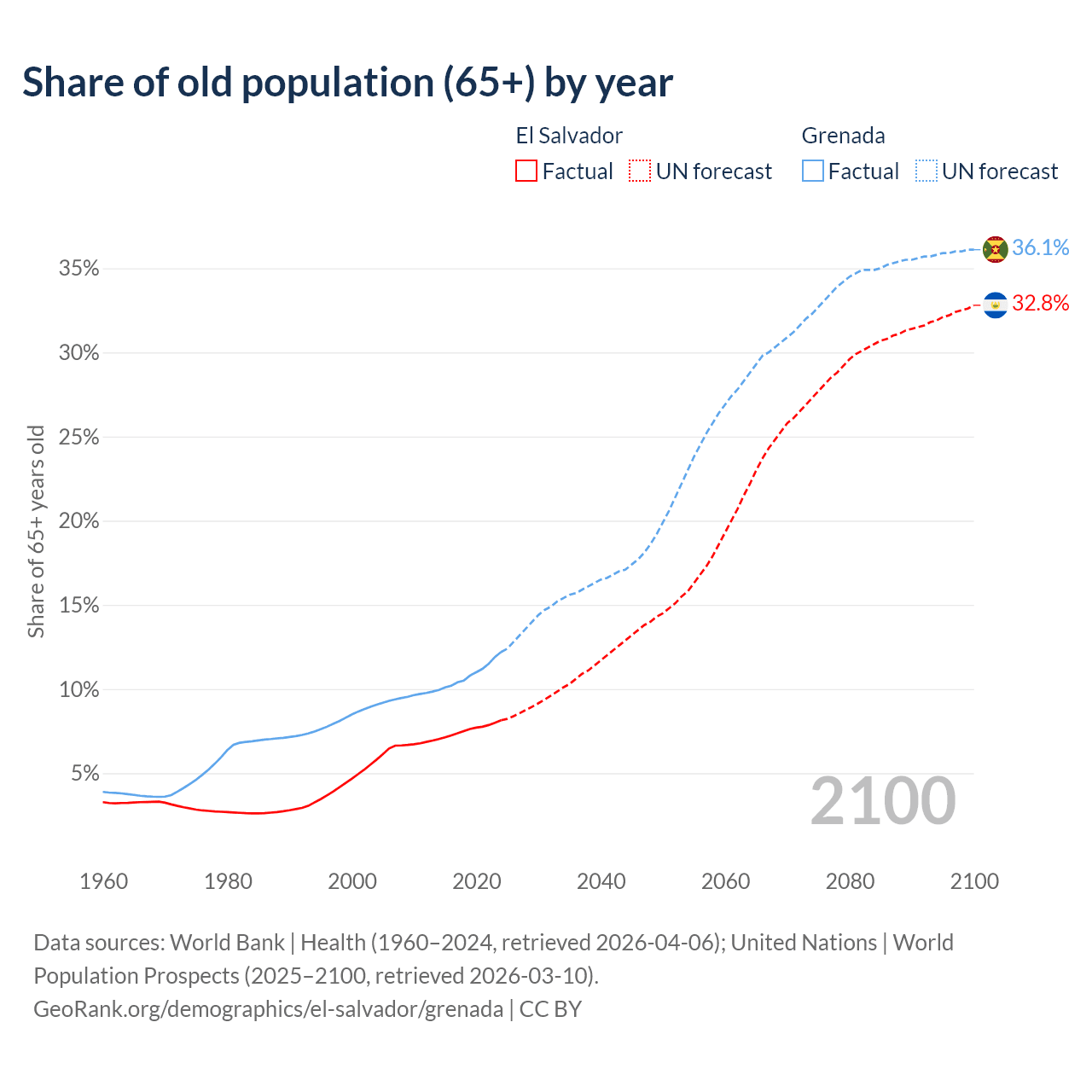 The share of older people aged 65 and over is 8.15% in El Salvador and 12.2% in Grenada. Life expectancy in El Salvador compared to Grenada .