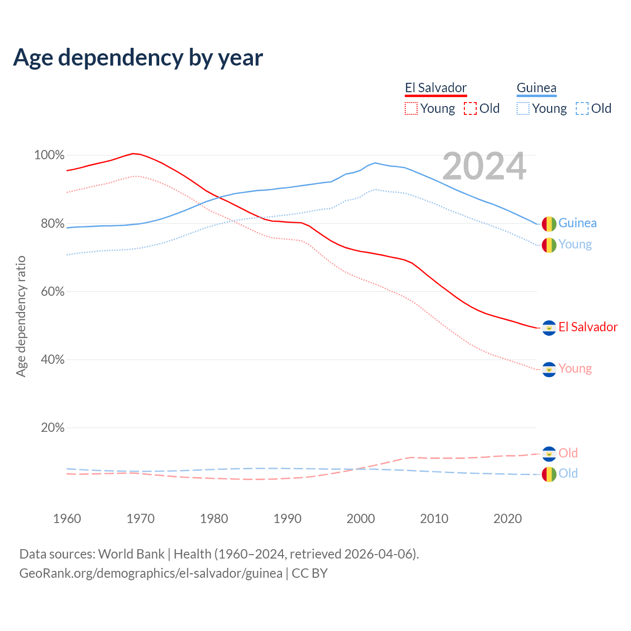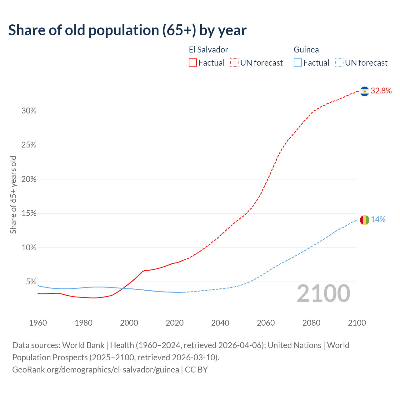 - The share of old-age demographic (65+) in El Salvador is 8.15% vs 3.46% in Guinea.