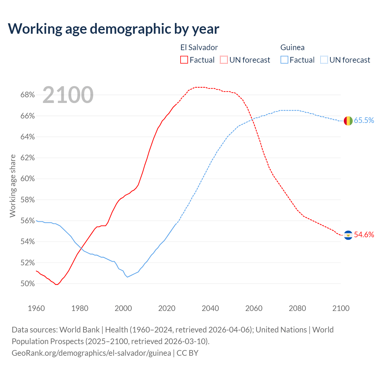 Median age El Salvador vs Guinea, 1960-2100