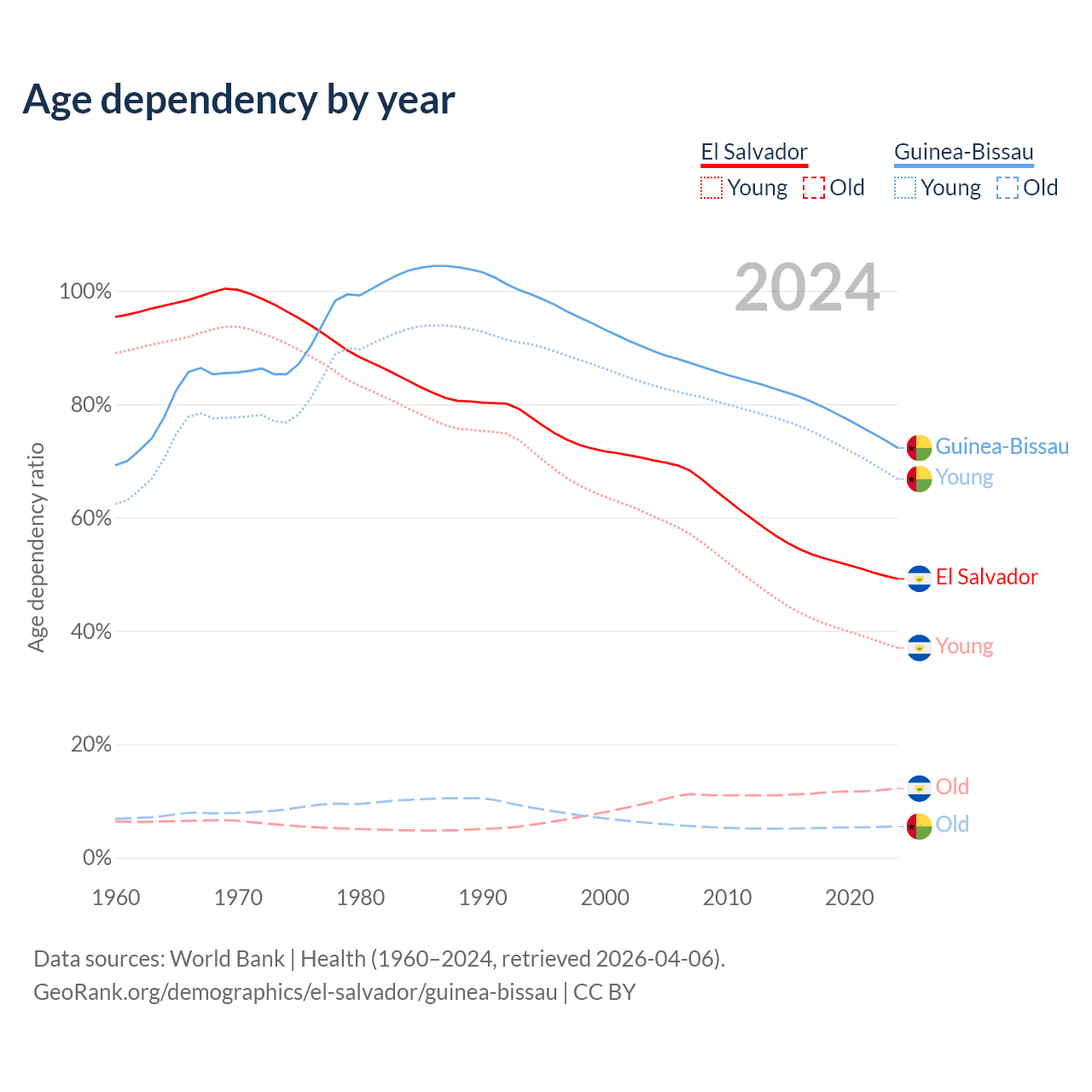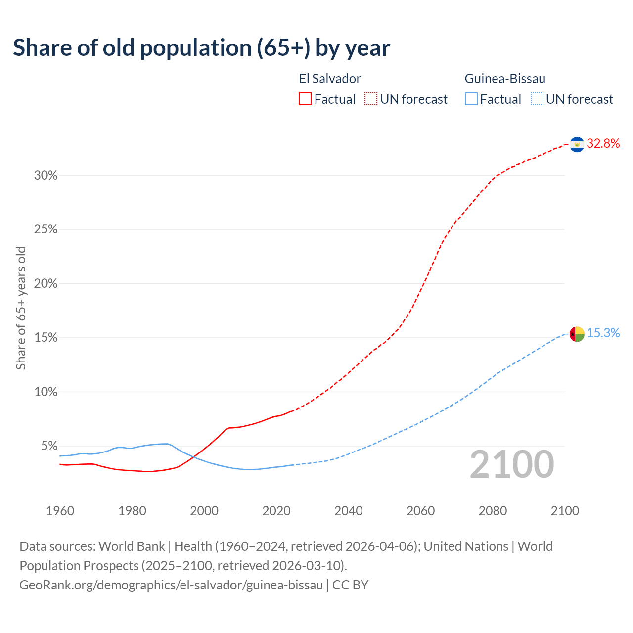 - The share of old-age demographic (65+) in El Salvador is 8.15% vs 3.19% in Guinea-Bissau.