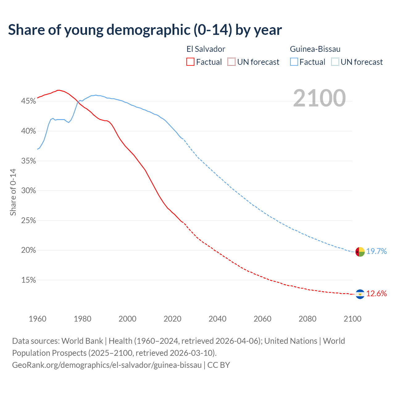 - The share of young demographic (0-15 years old) in El Salvador is 24.8% vs 38.8% in Guinea-Bissau.