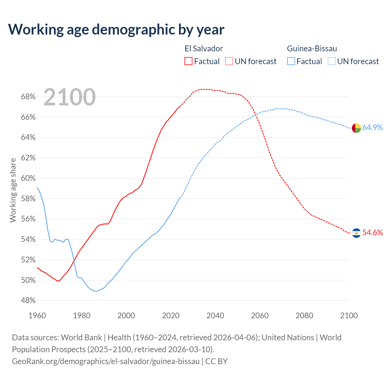 - El Salvador has 4.29M working age adults (aged 15-64) vs 1.34M in Guinea-Bissau.