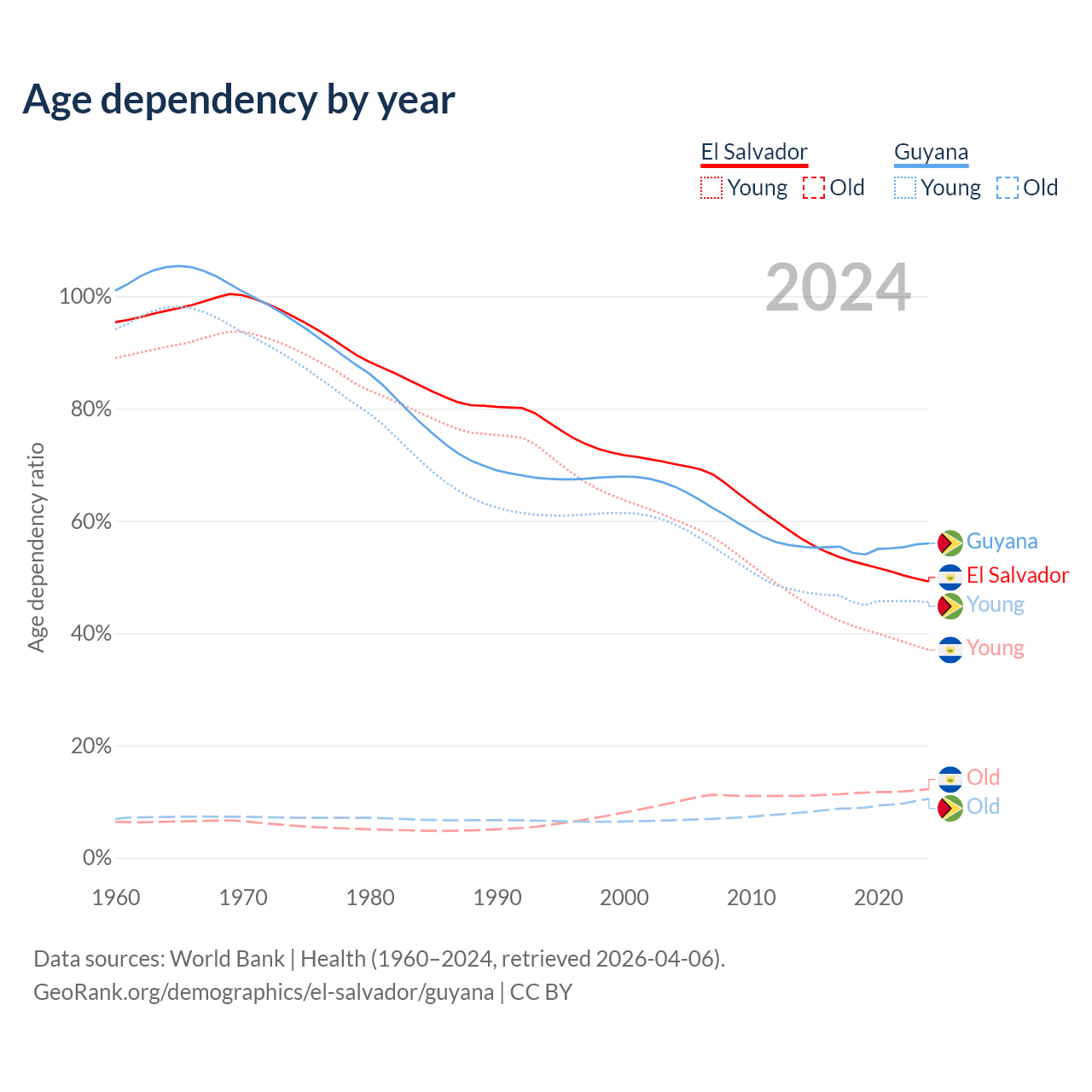 Data sources: World Bank | Health (1960–2024, retrieved 2026-04-06); U.S. Census Bureau (1960–2024, retrieved 2026-02-08).