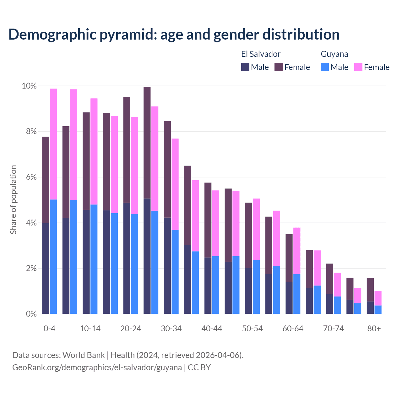 - The share of young demographic (0-15 years old) in El Salvador is 24.8% vs 29.2% in Guyana.