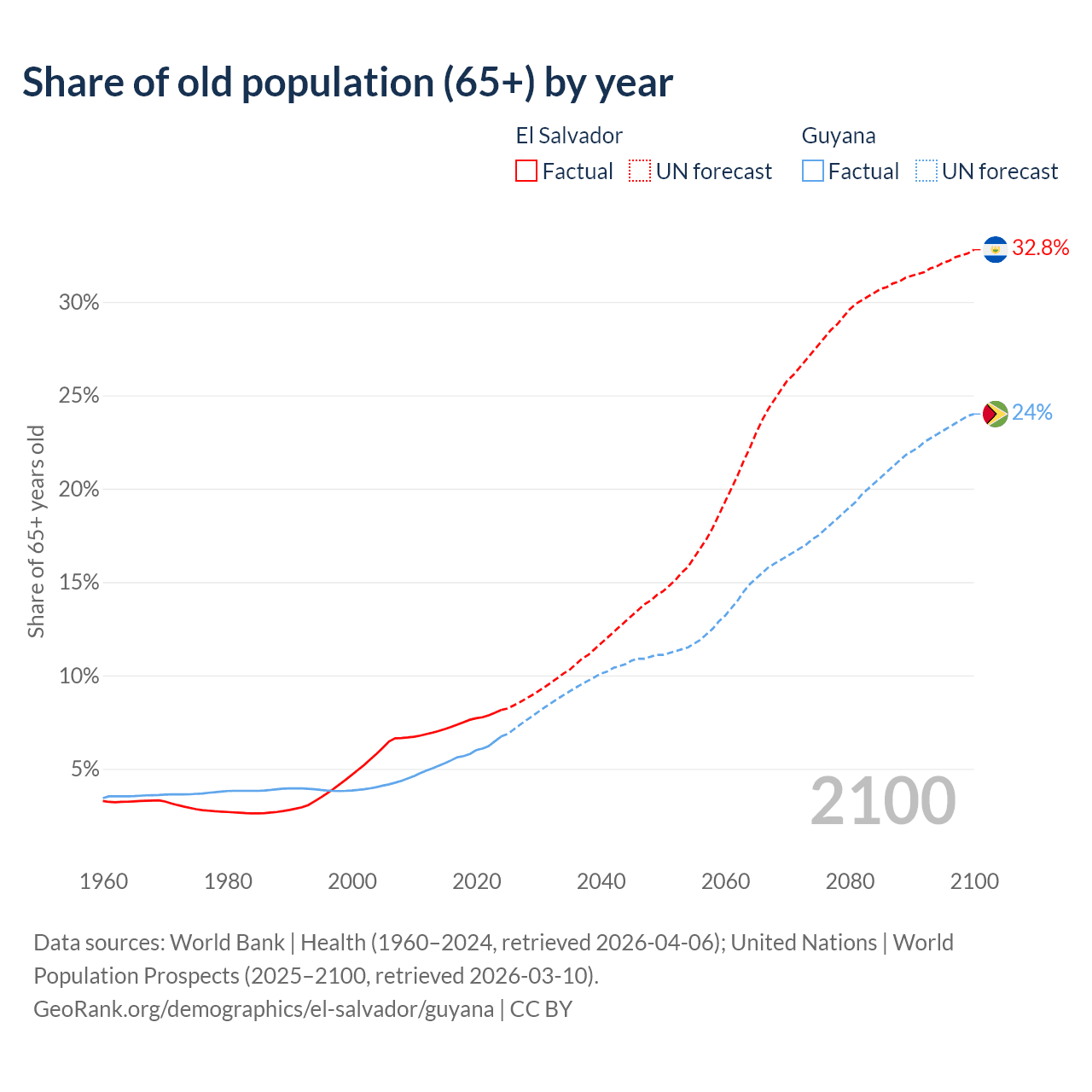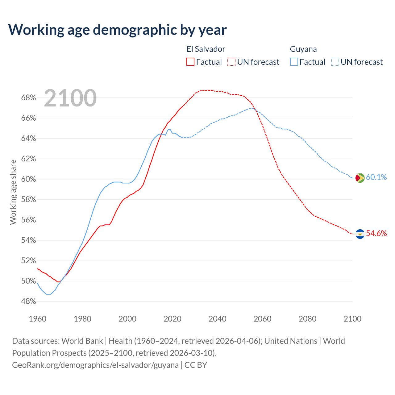 Median age El Salvador vs Guyana, 1960-2100