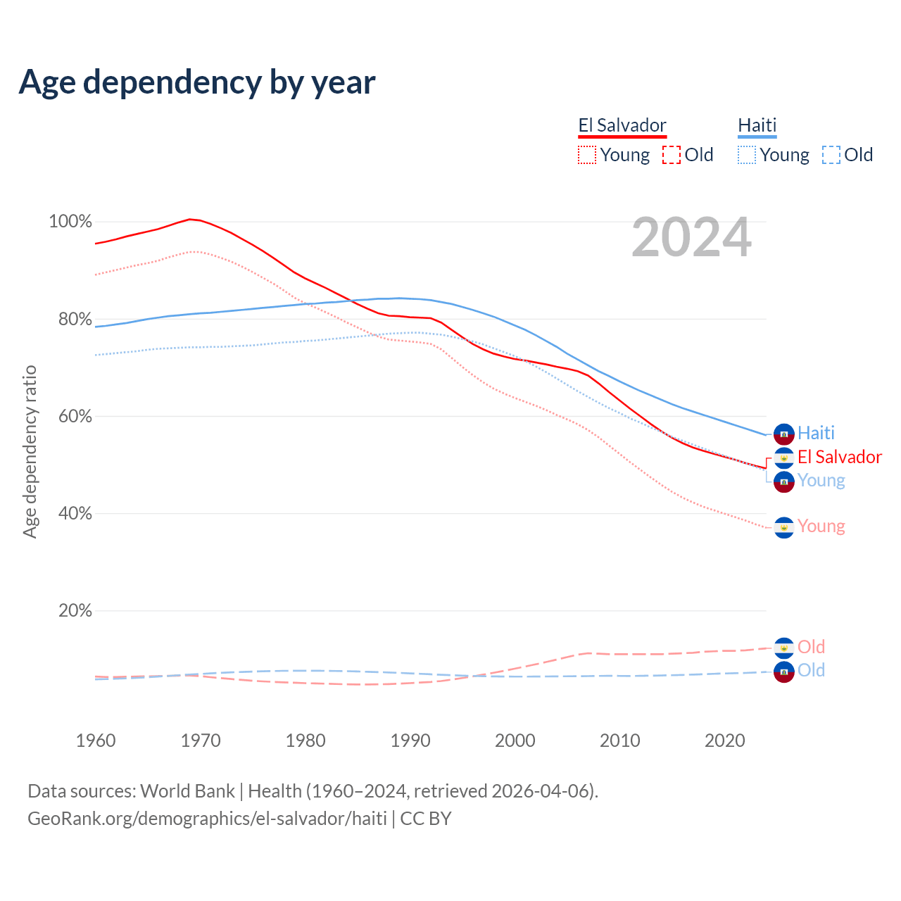 - El Salvador is ranked 115/196 by median age (oldest to youngest) vs 135/196 for Haiti.