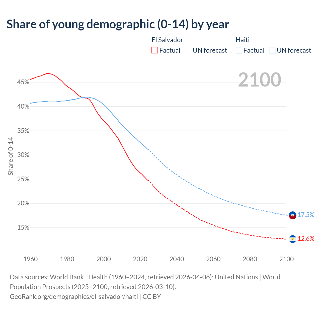 - The share of young demographic (0-15 years old) in El Salvador is 24.8% vs 31.2% in Haiti.