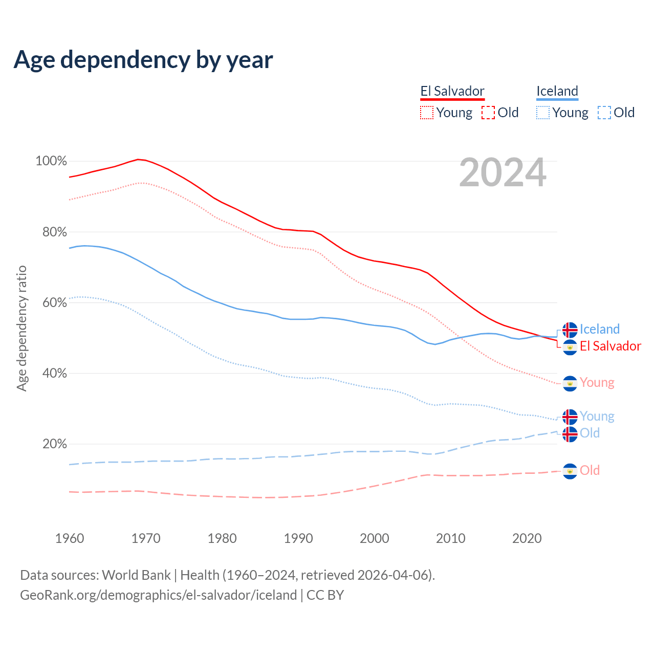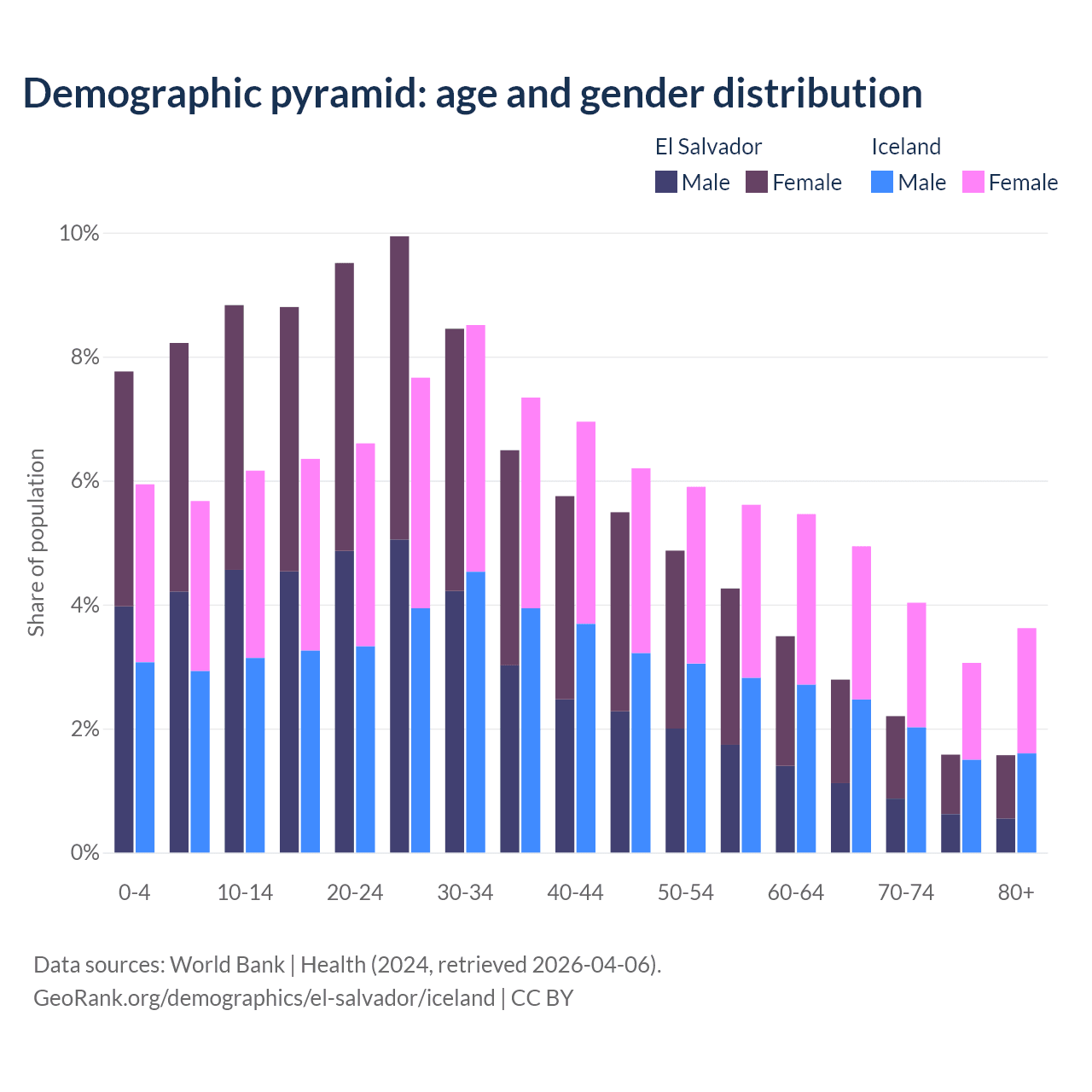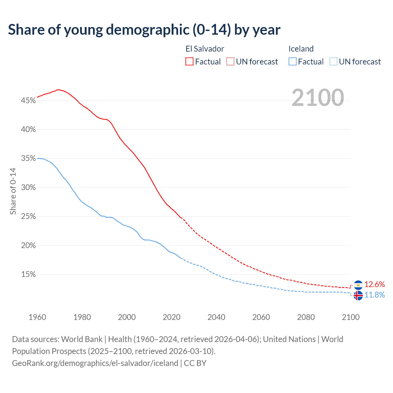 - The share of young demographic (0-15 years old) in El Salvador is 24.8% vs 17.8% in Iceland.
