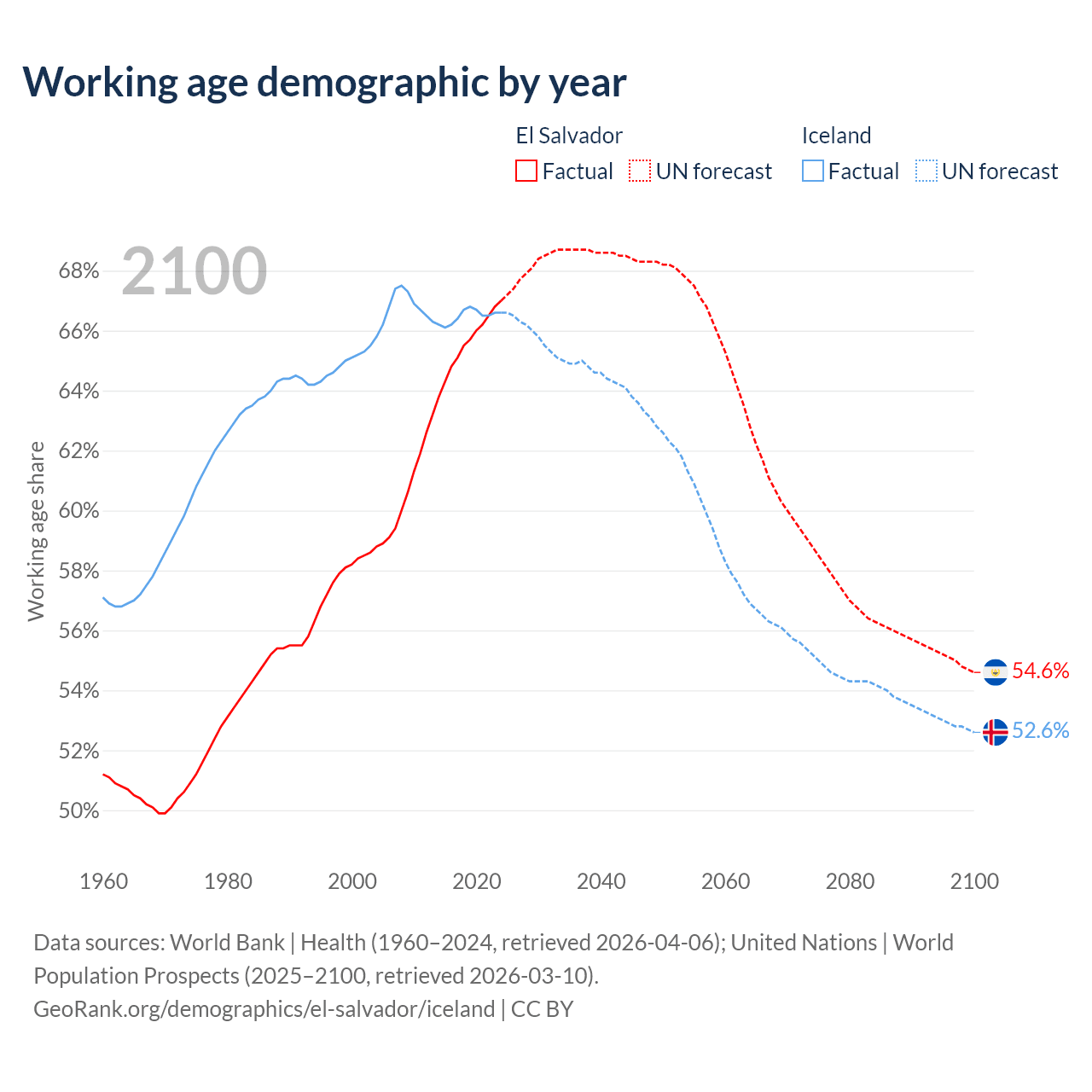 Median age El Salvador vs Iceland, 1960-2100