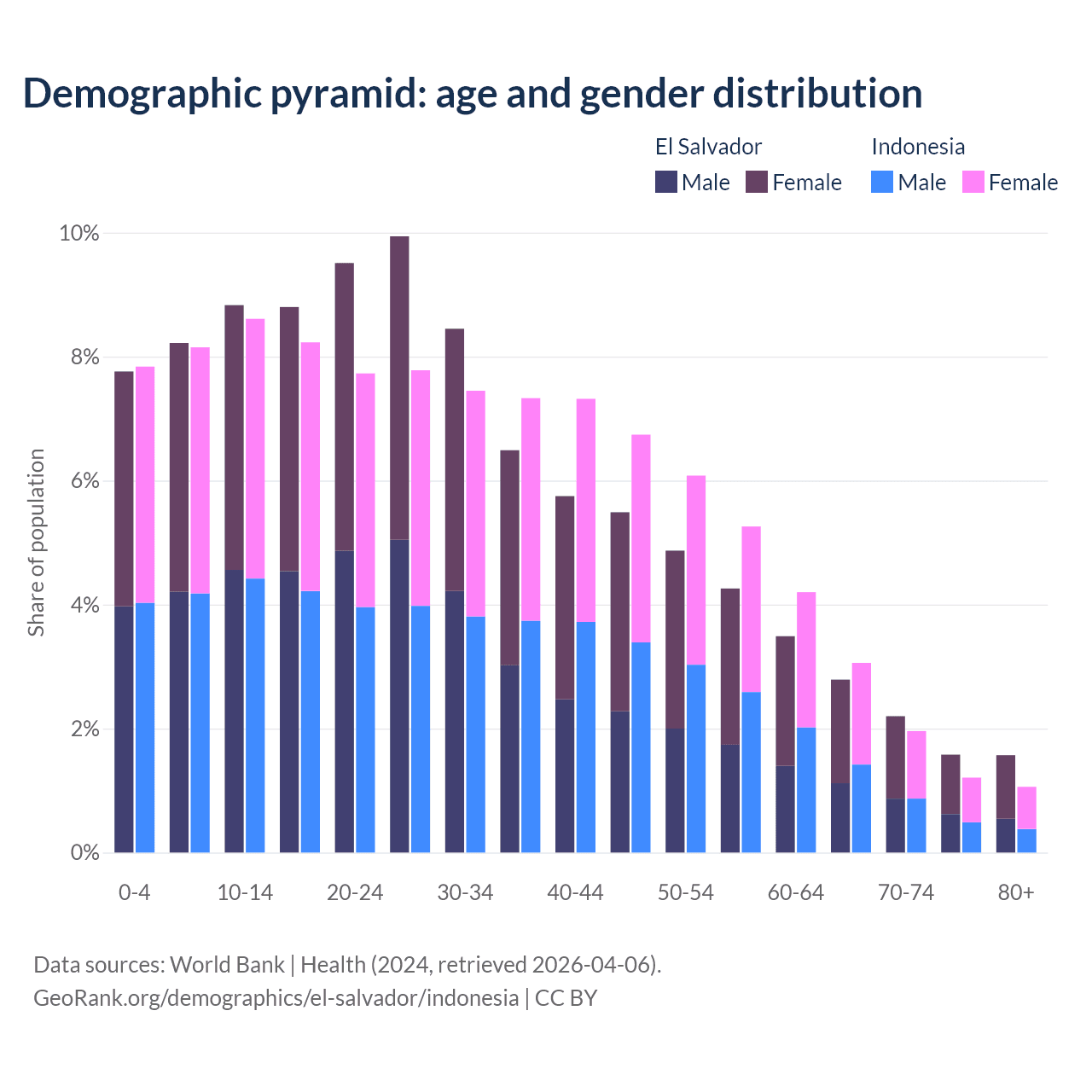 - El Salvador is ranked 115/196 by median age (oldest to youngest) vs 93/196 for Indonesia.
