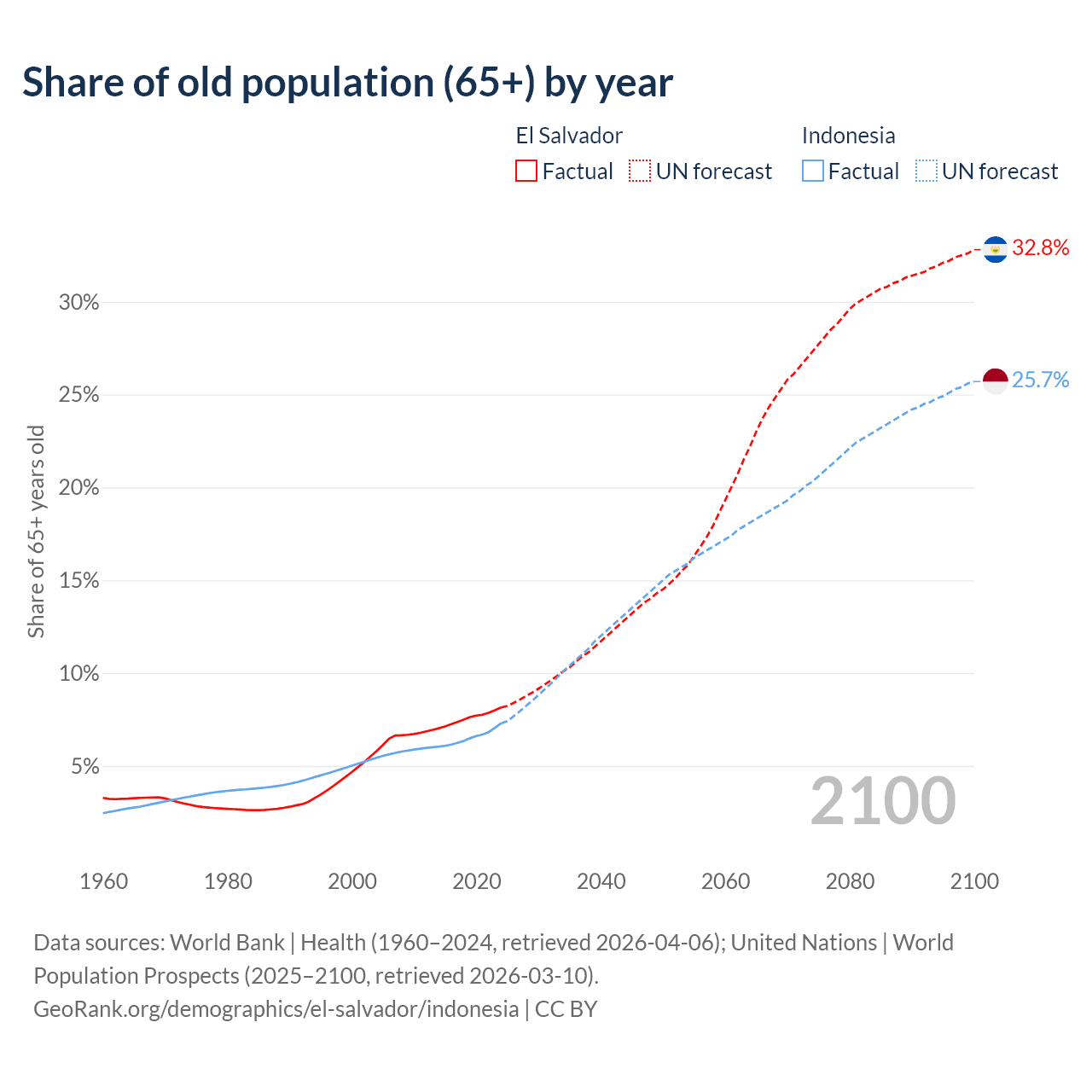 The share of older people aged 65 and over is 8.15% in El Salvador and 7.29% in Indonesia. Life expectancy in El Salvador compared to Indonesia .