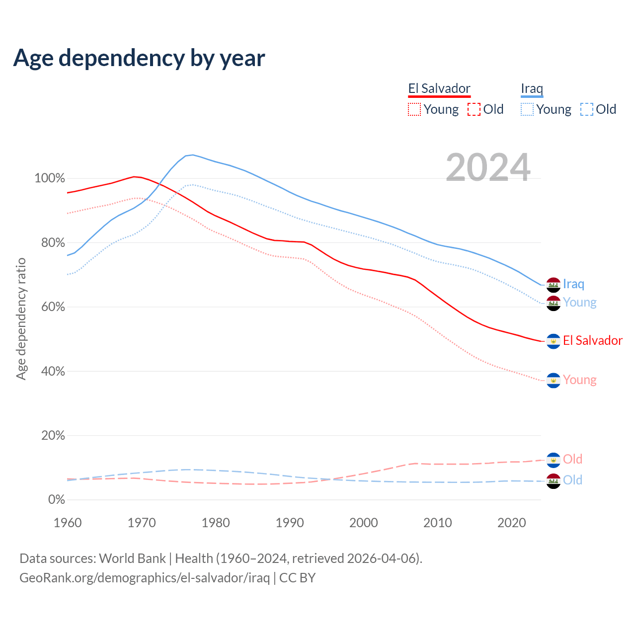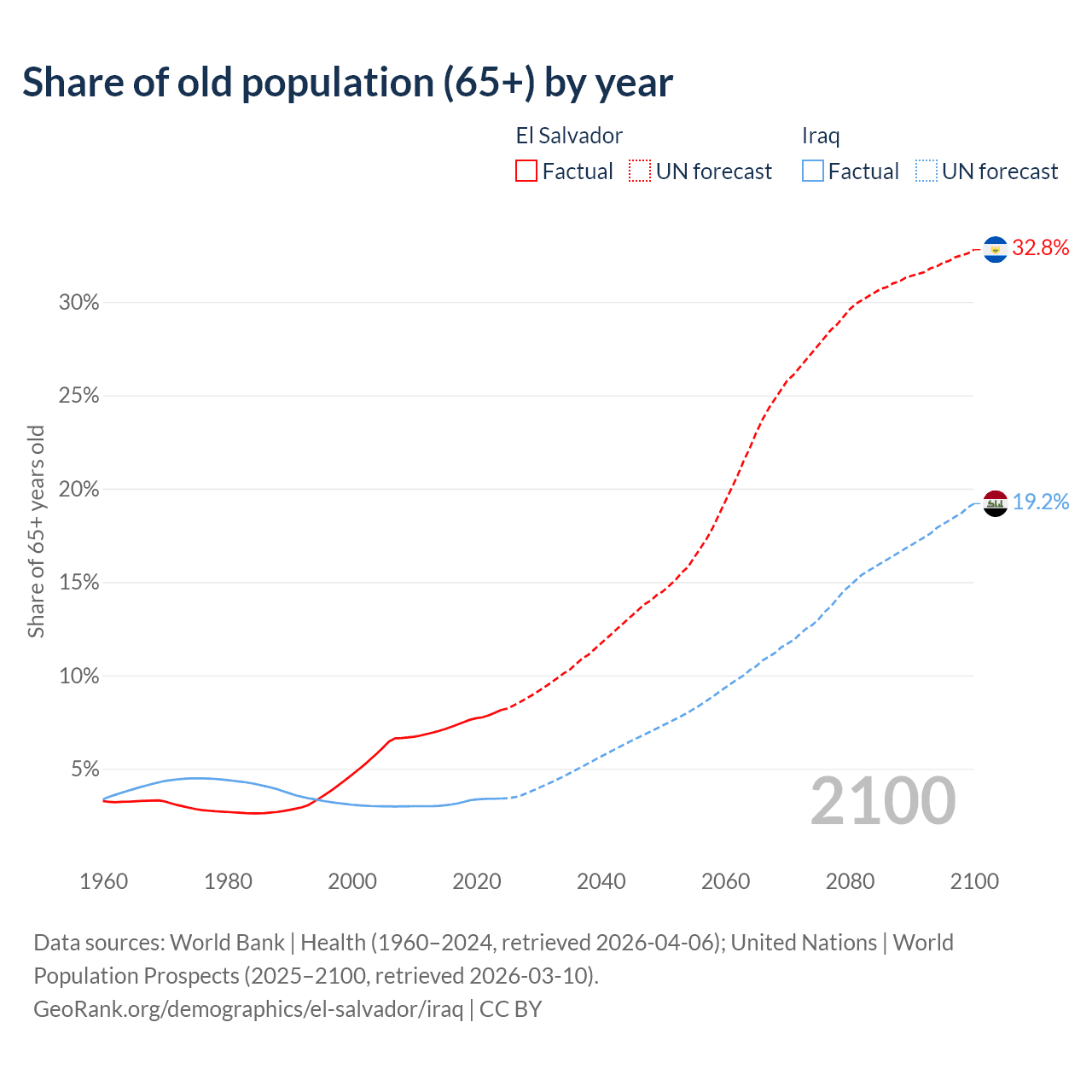 - The share of old-age demographic (65+) in El Salvador is 8.15% vs 3.41% in Iraq.