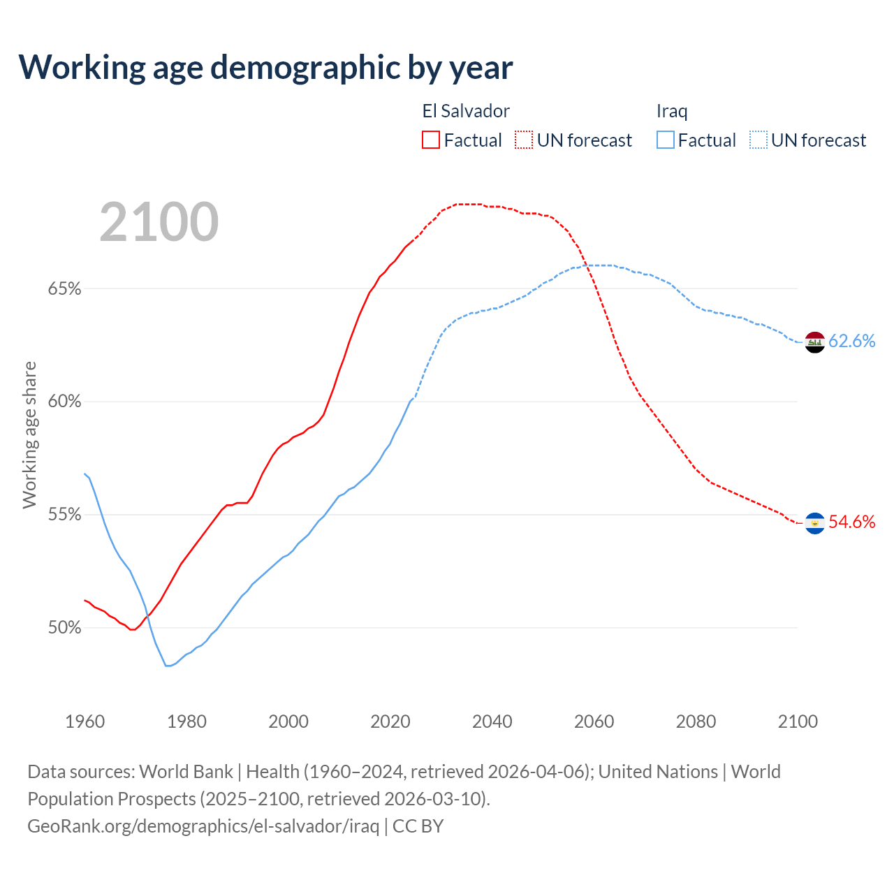 Median age El Salvador vs Iraq, 1960-2100