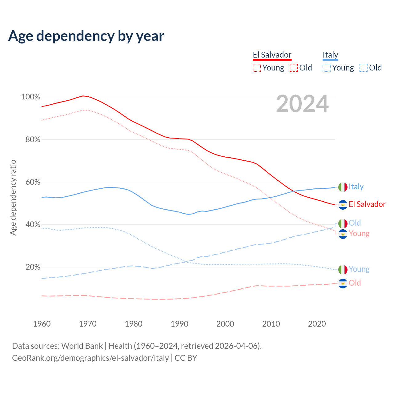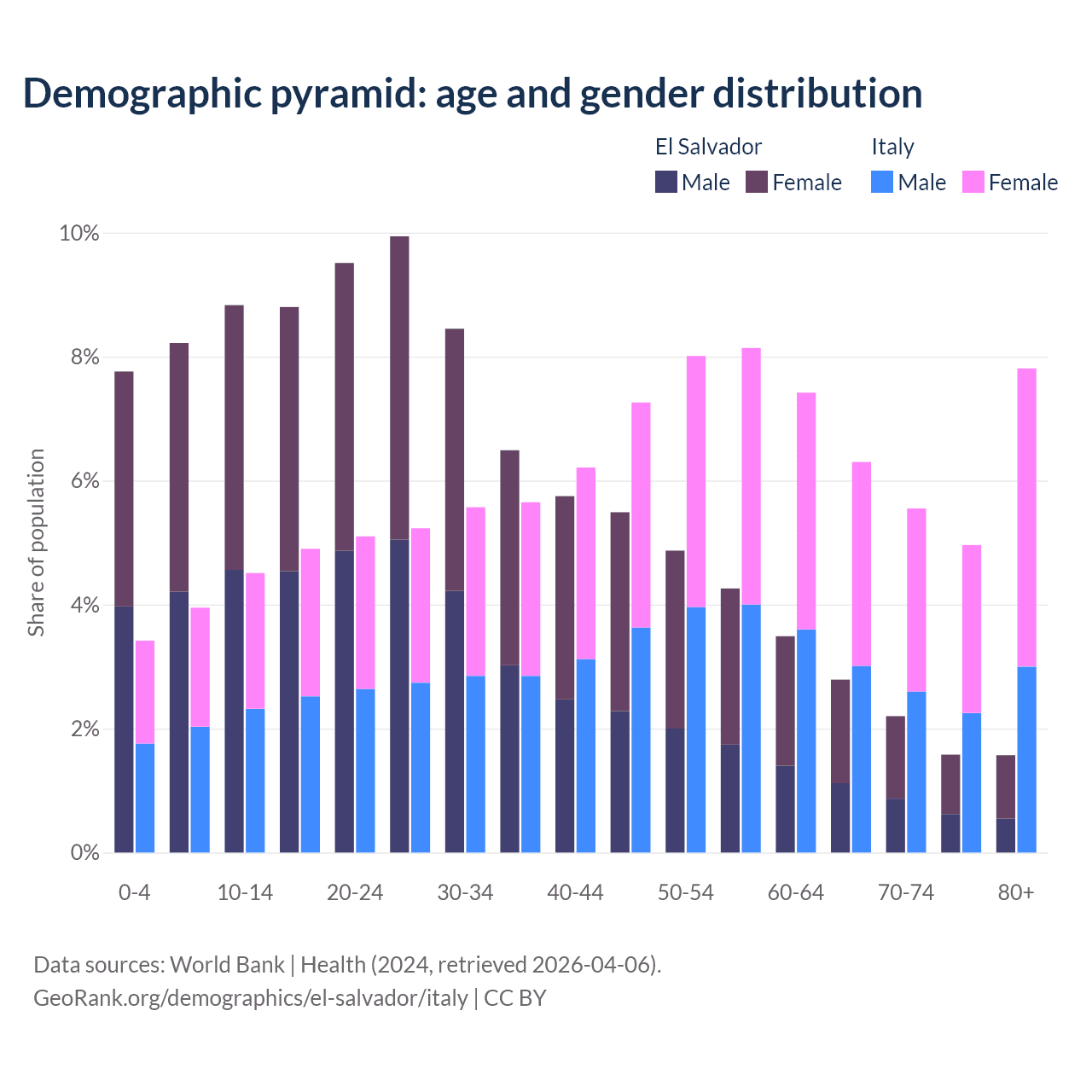 The share of older people aged 65 and over is 8.15% in El Salvador and 24.6% in Italy. Life expectancy in El Salvador compared to Italy .