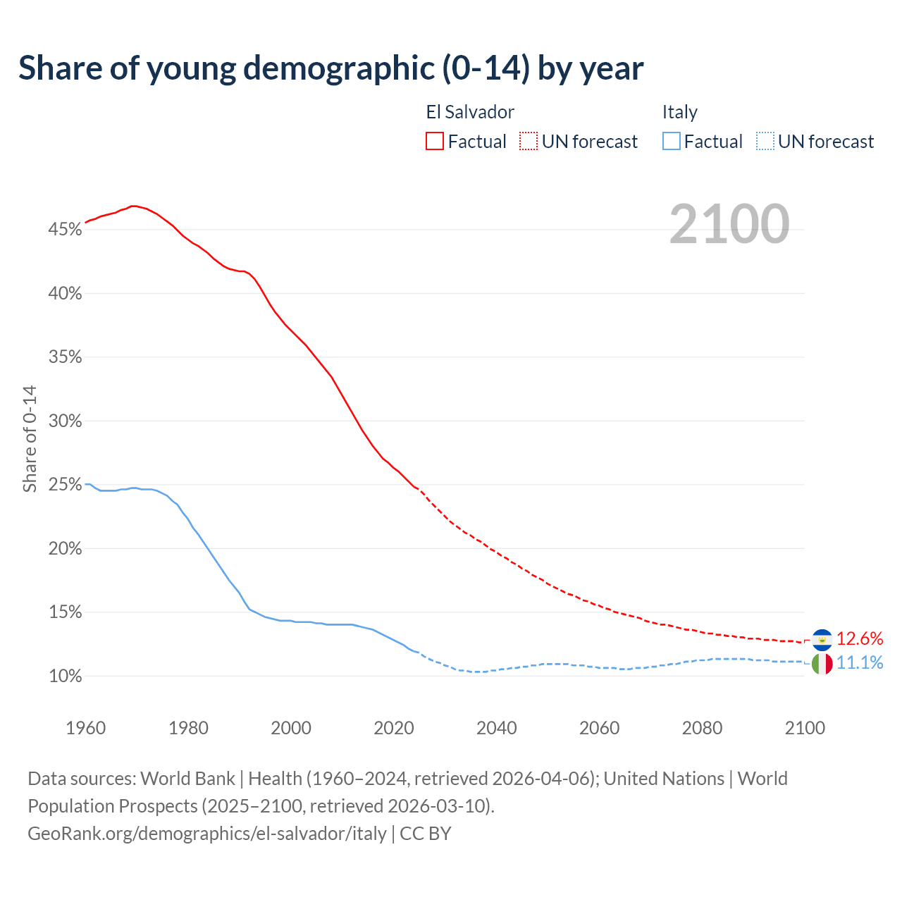 - The share of young demographic (0-15 years old) in El Salvador is 24.8% vs 11.9% in Italy.