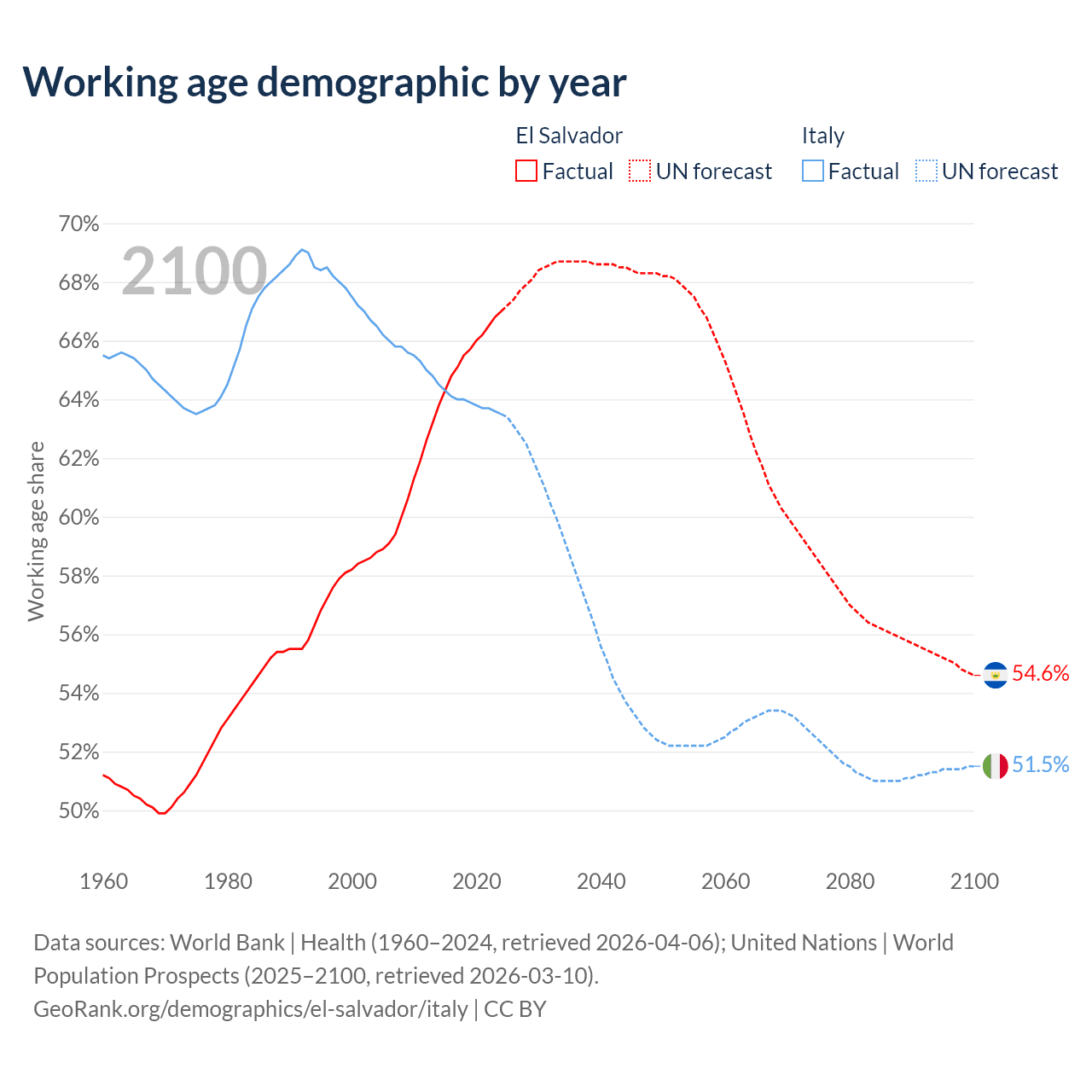 - El Salvador has 4.29M working age adults (aged 15-64) vs 37.2M in Italy.